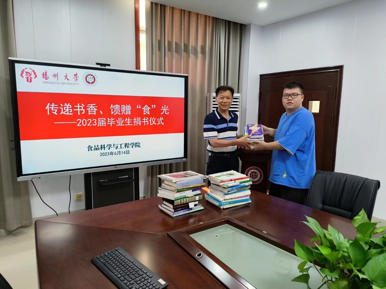 6月14日下午,在校关工委的倡导下,食品学院关工委举办“传递书香、馈赠‘食’光”2023届毕业生捐书仪式。校关工委联络站刘军主任、毕业生代表参加了仪式。在我院毕业生中发起捐书倡议后,得到了研究生、本科生的积极响应,共募集118本各类书籍,活动旨在营造知识传承、回馈母校的毕业氛围,激励有需要的困难学子奋发有为、不负时代、不负韶华。