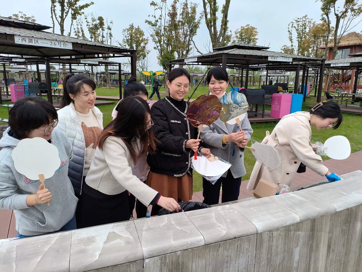 北湖湿地公园拥有“三十二西湖”“柳湖”“荒湖”三大板块16个景观区,建成总面积约399公顷,风景秀美。在欣赏美丽春景的同时,女教工们体验了花草书签、非遗漆扇制作。他们以漆为墨,在心灵手巧地制作下,一幅幅美丽的漆扇被创作出来。女教工们沉浸式体验了非遗文化,收获满满,留下了美好的回忆。随后在公园里成群结队掼蛋和露营烧烤,现场响起一阵阵的欢声笑语。