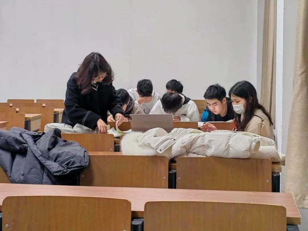 另一边,是机械制图的辅导专场,李菁菁、徐艺、叶国志三位同学根据课程特点和学习经验,采取一对一的讲授方式,亲自画图示范,讲解原理,帮助同学们尽快掌握。随着学长学姐的热情分享和耐心讲解,大一的同学们豁然开朗,恍然大悟。浓厚的学习氛围萦绕在灯火通明的文津楼。
