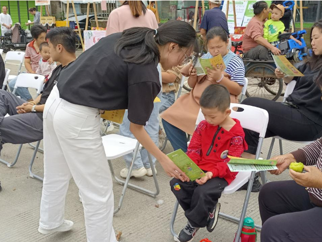 我院学生在现场也为大家带来了食物魔法表演。李欣雨先向村民们介绍了食品安全的相关知识,收获了大批村民的驻足。在互动环节中,吴玉琪利用显微镜观察细胞切片,展示食物的微观世界。吴玉琪将显微镜调整好后递给小朋友们观察,“哇!原来一个小小的洋葱皮里有这么多的细胞!”现场的小朋友们惊叹道。“姐姐,你们什么时候结束,我想把我的朋友喊过来一起观察。”现场的小朋友兴奋不已,成群结队的小朋友不断拥到展台前纷纷表示要参与活动。同时,朱芷馨利用仿真食物与小朋友积极互动,引导他们合理膳食,从小培养健康的饮食习惯。此外,互动环节中还特别设计了亲子互动游戏,小朋友和家长看食物图片猜成语,现场一片欢声笑语。