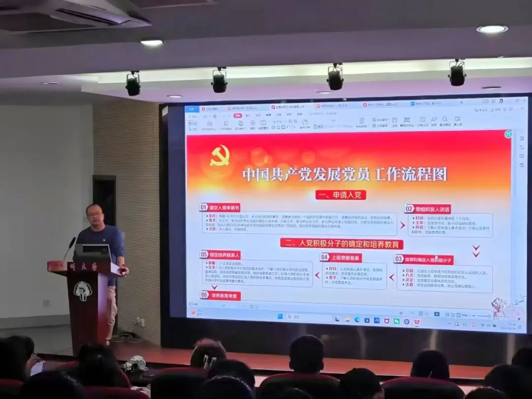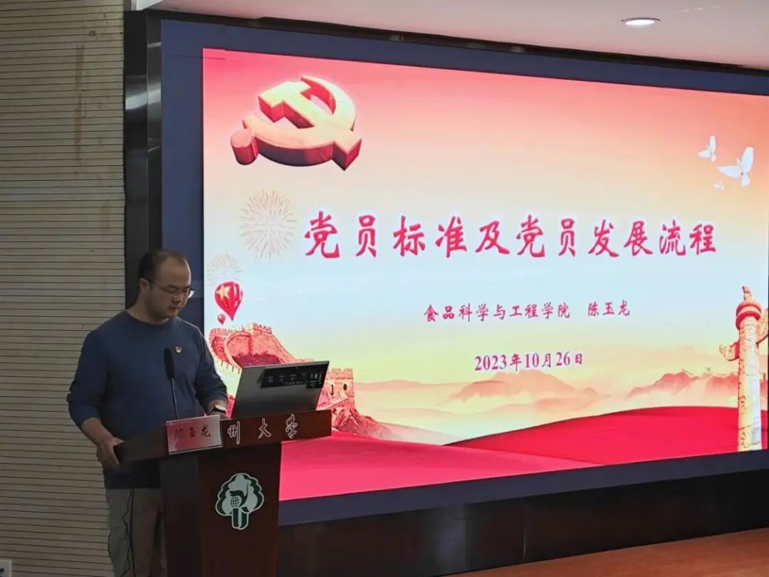 10月26日中午,扬州大学食品科学与工程学院于笃行楼N302召开了《党员标准及党员发展流程》课程,由院团委陈玉龙老师主讲。
