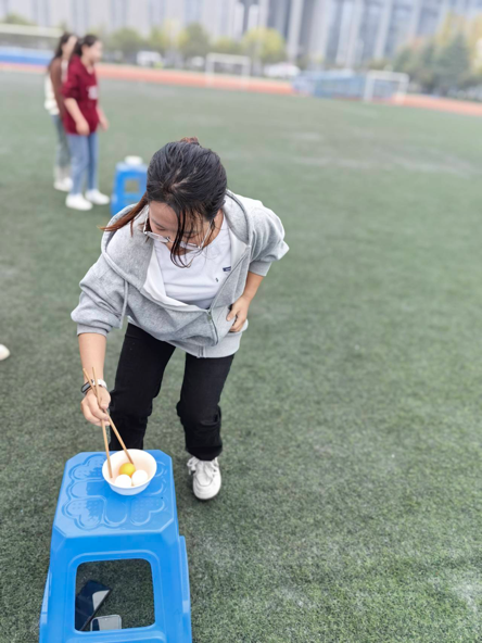 欢声笑语伴随着“筷子夹球”环节,选手们小心翼翼地保护着在筷子上小小的乒乓球,传球速度也不会落下。