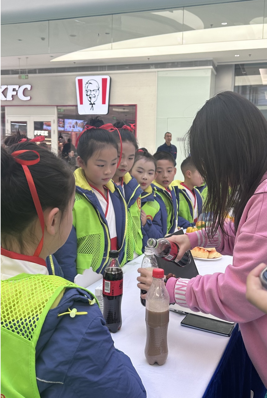 “可乐与牛奶一起喝会导致什么后果呢?”梁霞同学就这一问题,利用科学小实验的方式,为小朋友们做出了解答。“可乐中的碳酸根离子会和牛奶中的钙离子反应,生成碳酸钙,也就是我们看到的白色沉淀物,会造成人体消化不良,还会导致腹泻,所以可乐和牛奶不能一起饮用,两种饮品饮用间隔时间也不宜短于三小时哦。”
