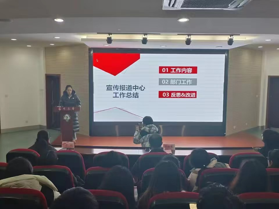 宣传报道中心主席王钰娴总结了2023年宣报中心四个部门的工作内容,详细阐述部门在公众号打造和外宣投稿的突出贡献、宣报中心组织的各项活动和各部门每周例会的开展情况,深刻分析了目前工作的不足,并为每个部门提出具体改进措施。