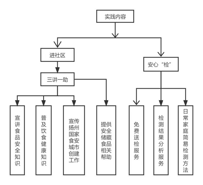 “食”刻安心志愿队聚焦扬州市食品质量安全问题,将理论与实践相结合,把“三讲一助”带入社区和市场,面向老年人、儿童等弱势群体开展食品安全知识普及和食品检测活动,让辖区居民更直接地了解和掌握日常食品安全方面的知识,增强居民食品安全的防范意识和自我保护能力,规避疾病隐患。