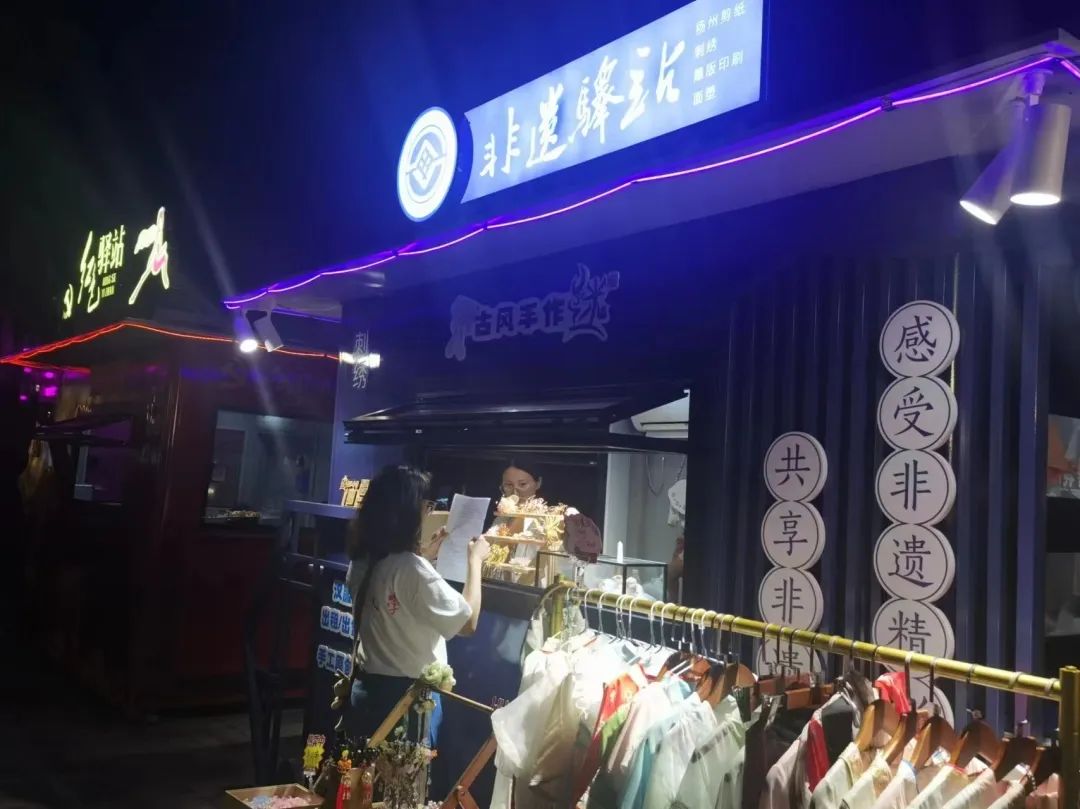 团队成员们步行进入瘦西湖夜市,眼前的古典灯笼、晕黄灯光和仿古摊铺让人仿佛穿越到古代的江南。明亮、繁华商业景象与灯光、湖面倒影共同构成了一幅美丽的画面,光与水交织出的景色让人不禁感叹这是一次与非遗文化的独特约会。