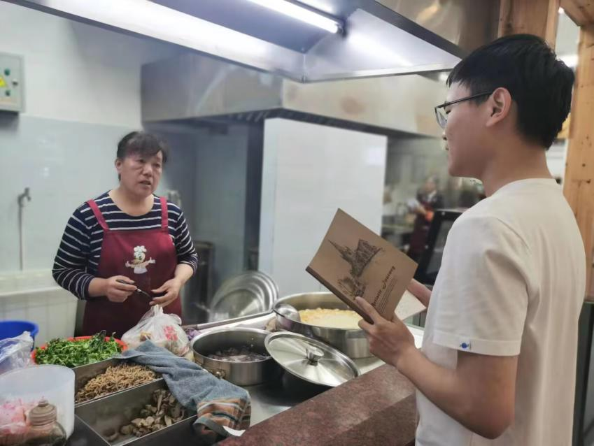 (图为7月6日,“尘世烟火气”集市文化调研团队成员龚琰峰在吾悦广场鸭血粉丝汤店采访店主。龚琰峰供图)