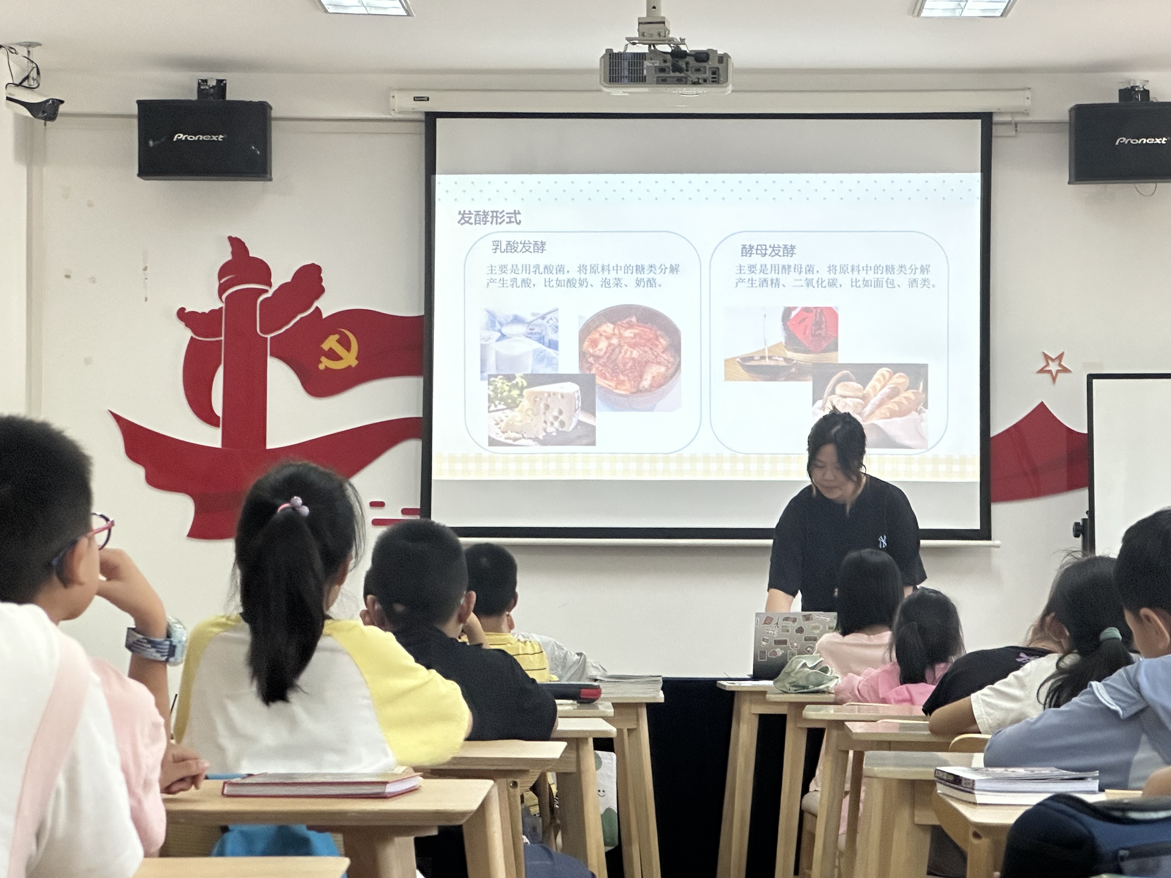 讲座从同学们熟悉的酸奶、馒头等日常食品切入,通过“食品连连看”游戏,帮助孩子们快速识别发酵食品与普通食品的区别。这个环节特别展示了传统发酵工具如泡菜坛子、酒曲等实物,并播放了发酵过程加速动画,让孩子们直观感受微生物的“魔法力量”。