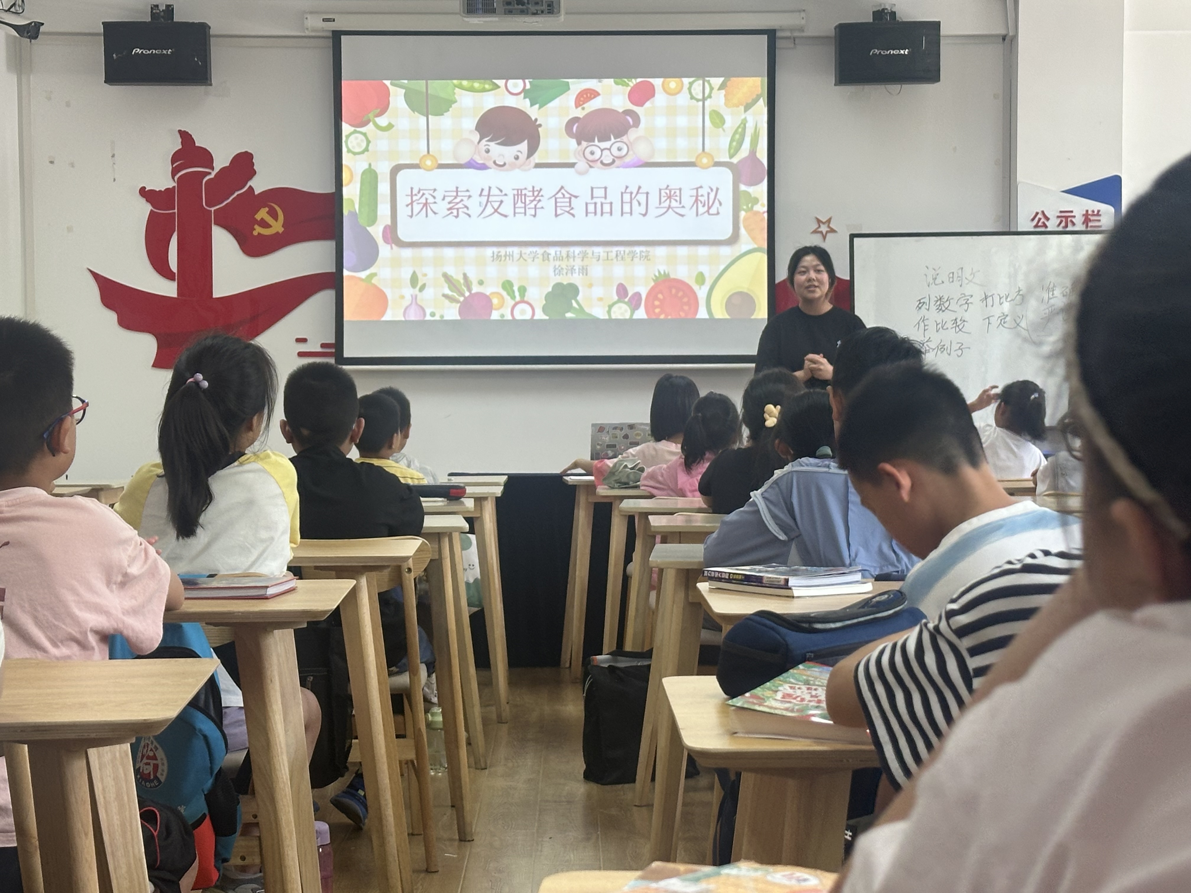 近日,上黄镇新时代文明实践所的爱心暑托班传来阵阵欢笑声,一场名为“探索发酵食品的奥秘”的小课堂正在这里举行。作为主讲人,食安2301班徐泽雨同学用生动有趣的方式向小学生们揭开发酵食品的神秘面纱。此次讲座分为三个部分:发酵食品基础知识、发酵的基本原理以及发酵食品的未来展望。徐泽雨希望通过互动实验和实物展示,让同学们在轻松愉快的氛围中学习科学知识。