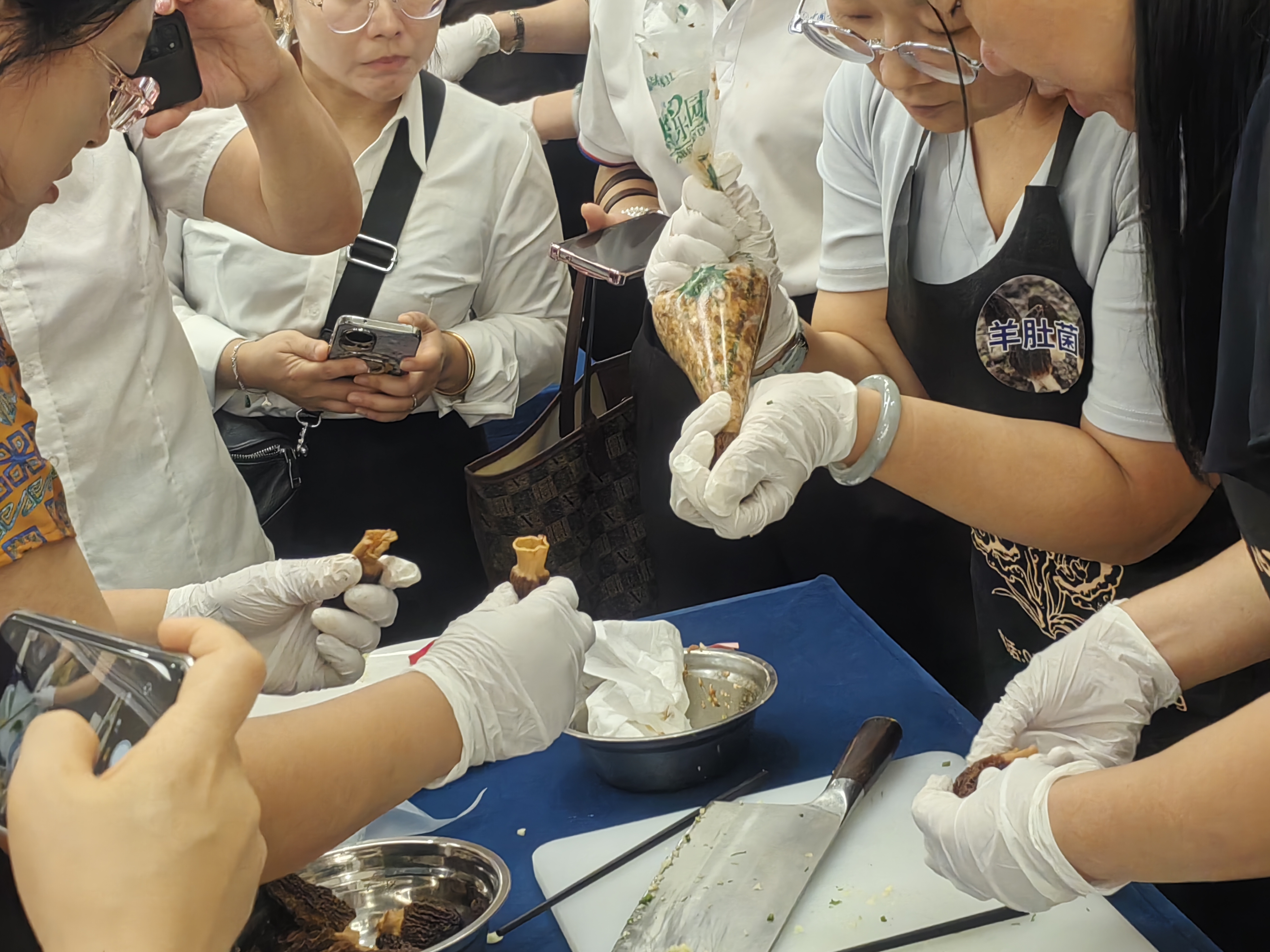 比赛现场宛若一个集市,而一个团队就犹如一家小店,他们在各自的领域内各显神通。实践团队将身影融入参观者的洪流,他们的眼睛中充满求知的欲望,目不转睛地盯着厨师们,同时凝神聆听着厨师们对菌菇营养的介绍。“牛肝菌拥有着高蛋白质,强生物活性和富矿物质,具有抗氧化、增强免疫力、促进发育的性质,作用群体广泛,是很好的食材。当羊肚菌遇上猪肉等食材一起烹饪,能够起到良好的协同作用”。羊肚菌队在介绍的同时,也运用熟练的刀工迅速将猪肉剁成了肉沫而后注入到羊肚菌中。