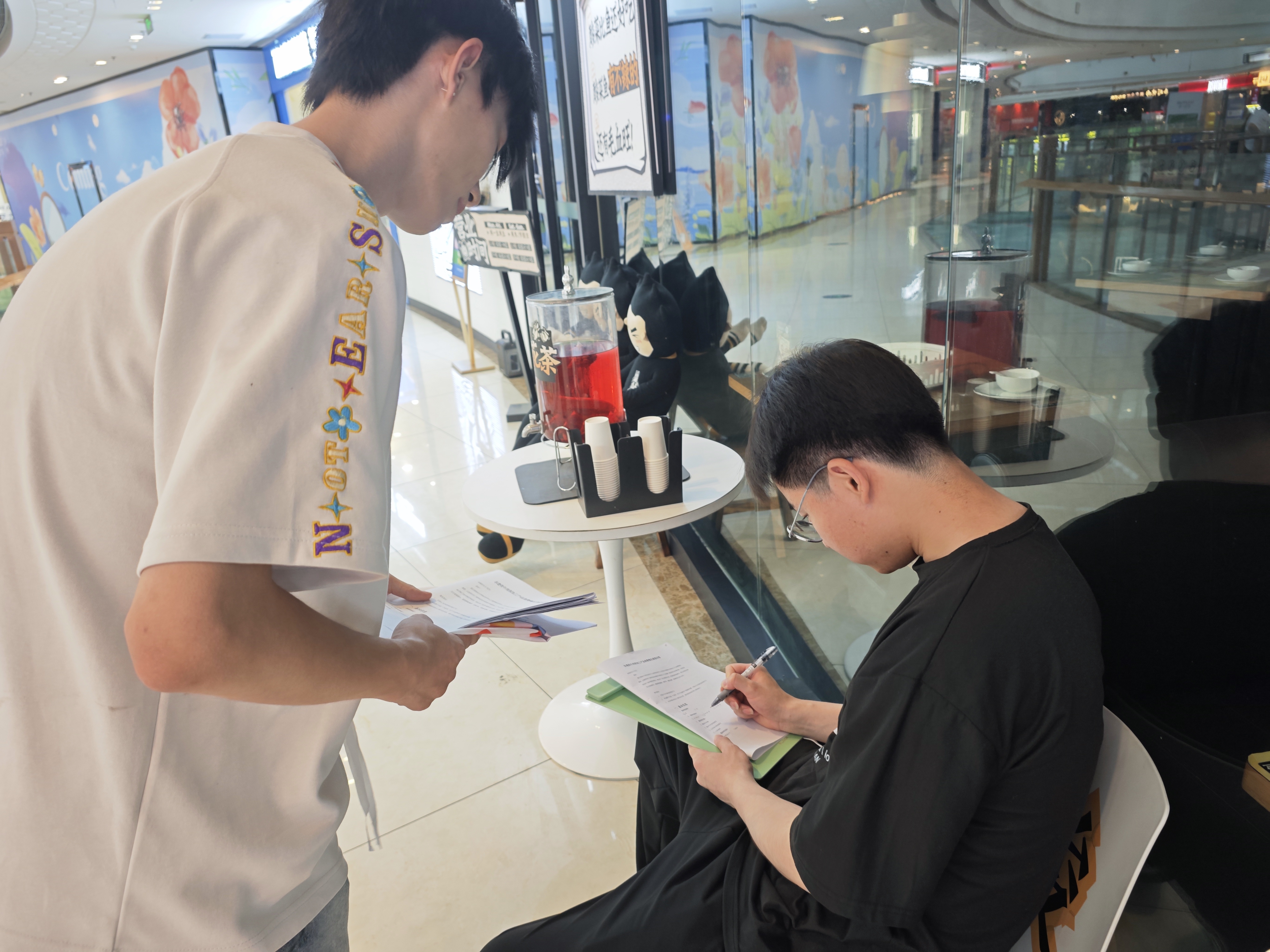 吾悦广场作为当地知名商场,人流量巨大,本是开展调研的绝佳场所。出发前,队员们个个信心满满,坚信能顺利完成调查任务。然而,现实却给了他们一记“重击”。当队员们手持问卷,满怀期待地请求路人协助填写时,迎来的却是一次次的拒绝。但队员们并未因此气馁,他们调整心态,继续向路人说明调研的目的和意义。幸运的是,部分路人在得知这是关于非遗食品的调查后,被队员们的坚持和对非遗文化的热情所打动,愿意驻足配合填写问卷。在路人填写问卷的过程中,队员们还从旁细心指导,确保每一份问卷数据都真实可靠。