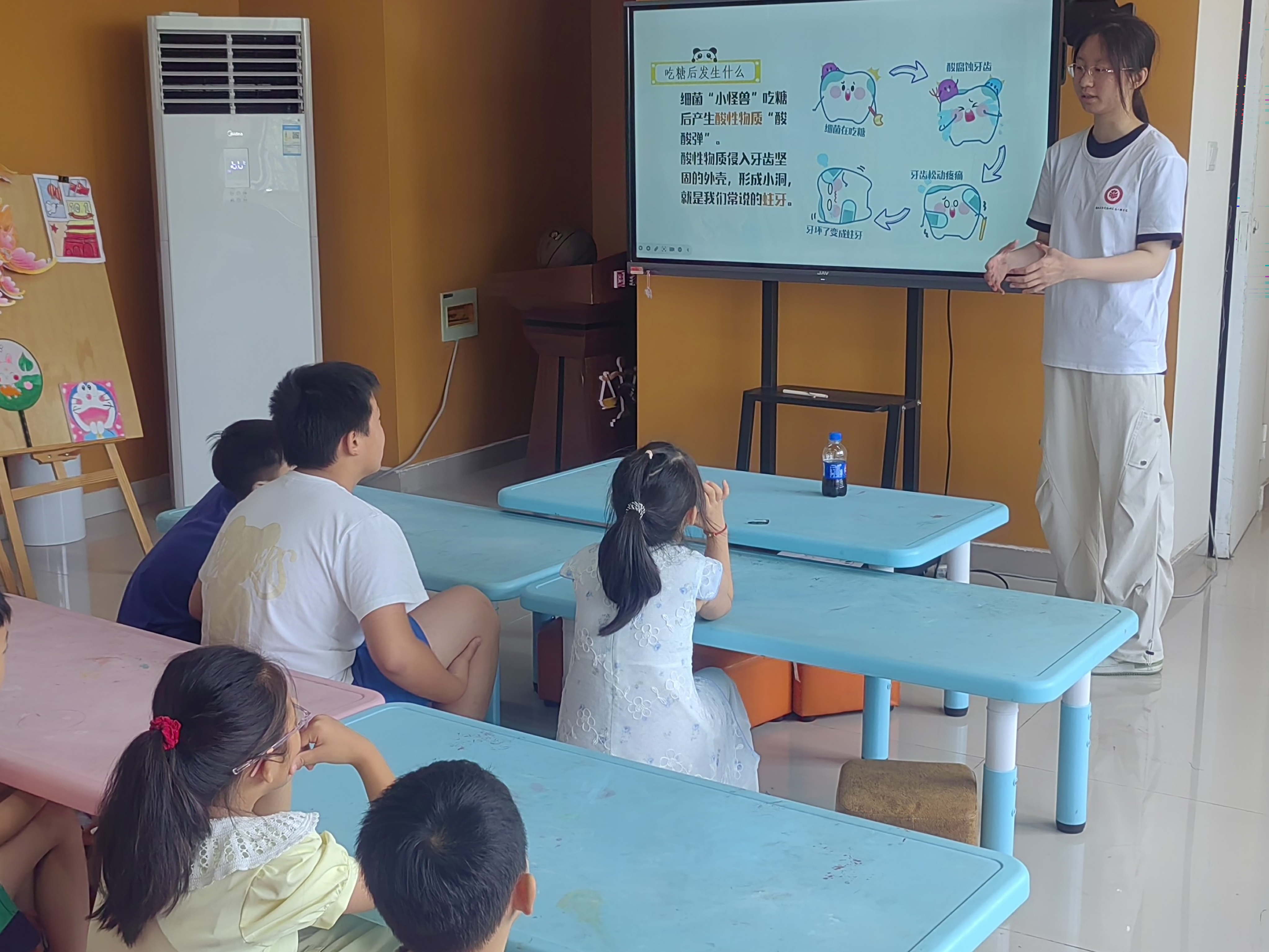 接下来,钱诗琪与居亦乔化身“健康小导师”,用卡通图片、趣味模型深入浅出地向小朋友们讲解牙齿结构、蛀牙成因及正确刷牙方法,现场气氛热烈。