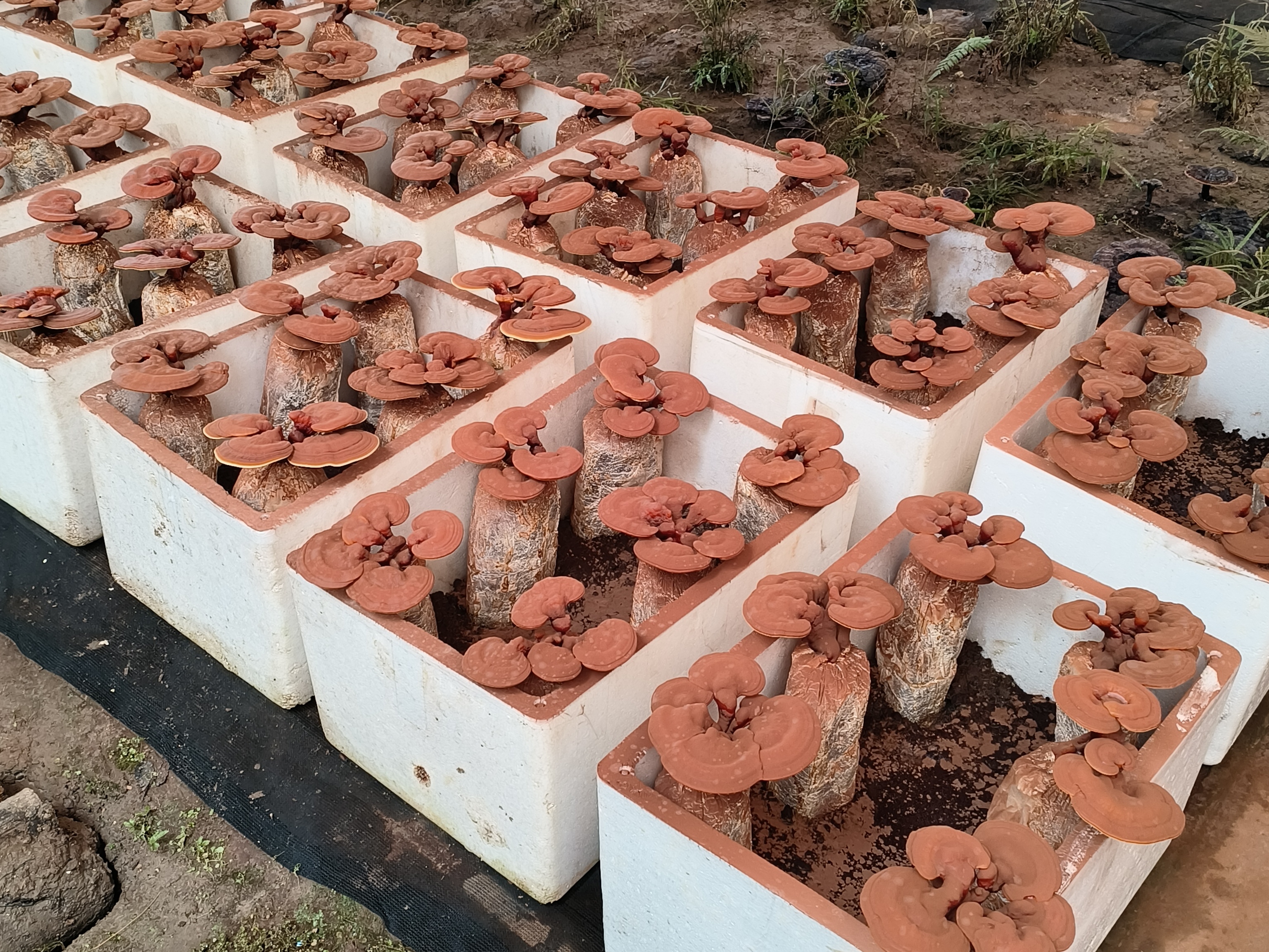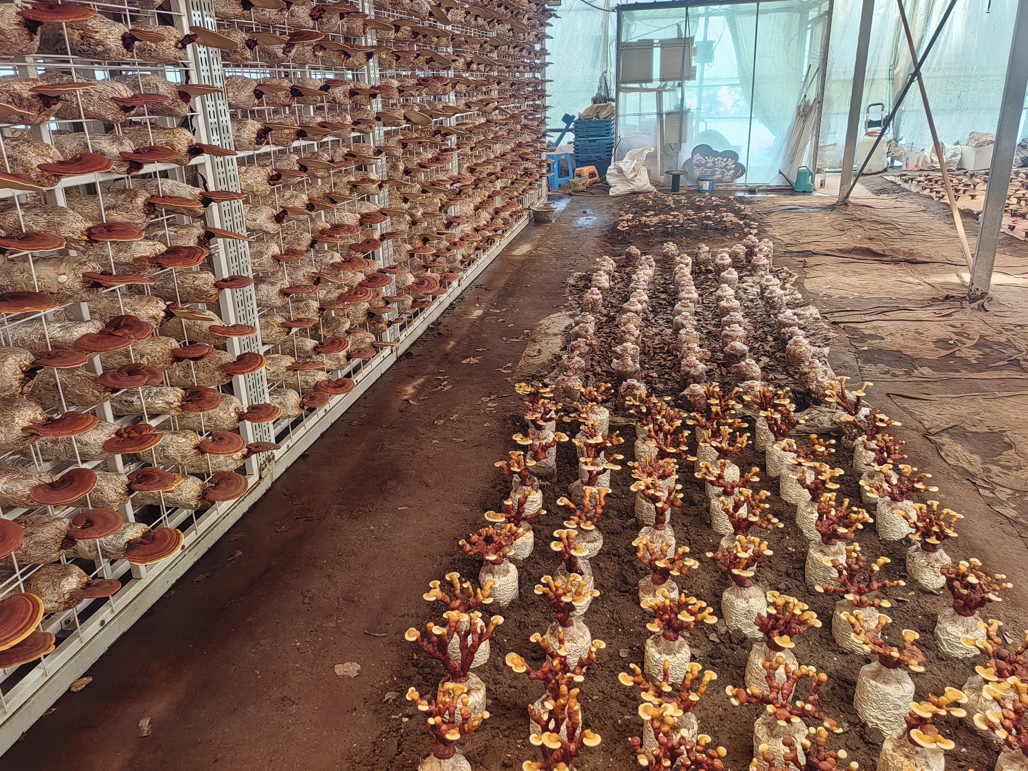 在基地技术人员的引导下,实践团成员们穿梭于排列整齐的种植架间,仔细观察不同生长阶段的灵芝。与大型生产基地的工业化种植不同,这个小规模基地更像一个“灵芝品种展示园”,种植了赤芝、紫芝、黑芝、云芝等多个品种。团队成员观察了不同品种灵芝的菌盖纹路、菌柄形态等特征差异,每种灵芝都展现出独特的形态特征。