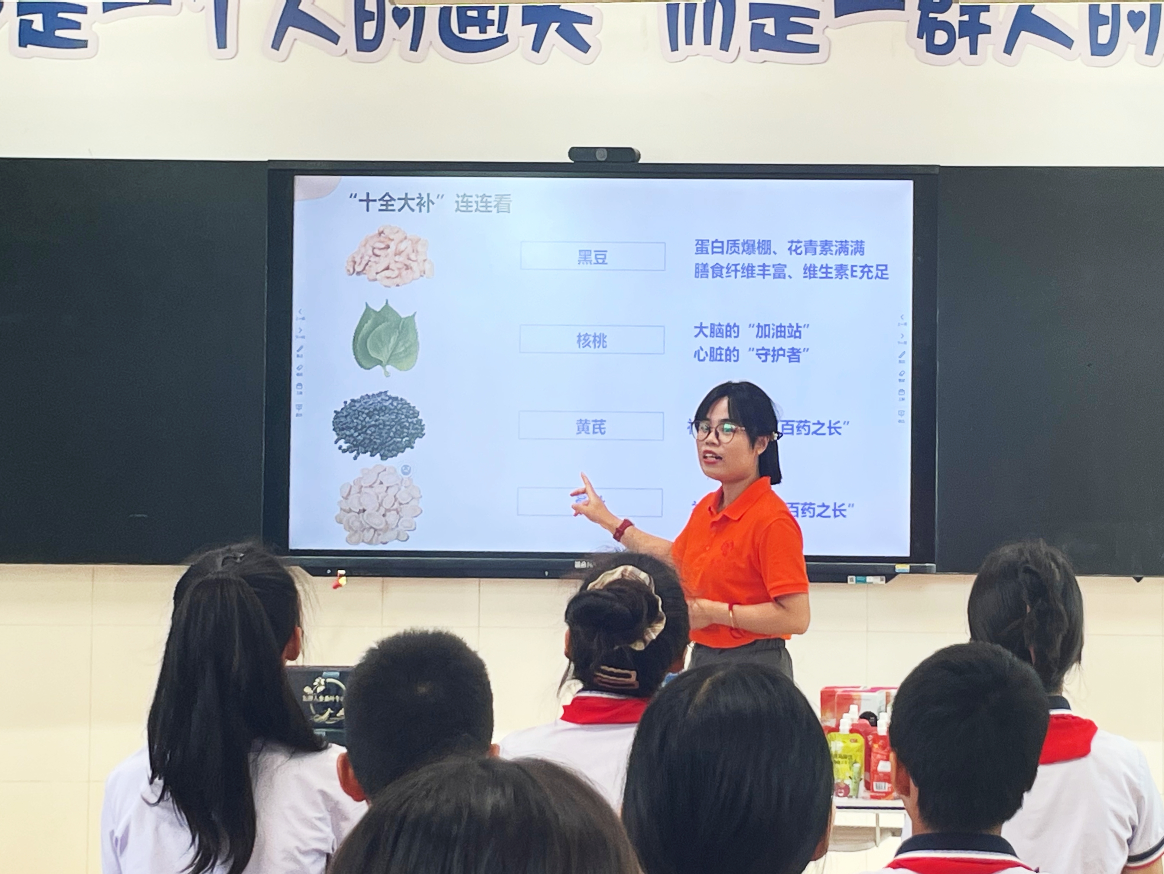 近日,“食”力兴农科技助农服务团走进江苏省宿迁市泗洪经济开发区小学,开展了一场主题为“药食同源助力健康体重”的科普宣讲活动,为孩子们带来了别开生面的一课。
