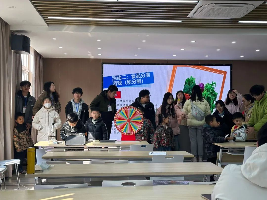 首先,潘炫羽同学先放了几个有关食品科学的短视频,快速将小朋友代入探索科学的氛围中,视频放完后,很多小朋友意犹未尽,积极举手表示喜欢该类食品探索,想要了解更多。因此,为满足小朋友的好奇心,让他们更有参与感,现场玩起了食品分类游戏。