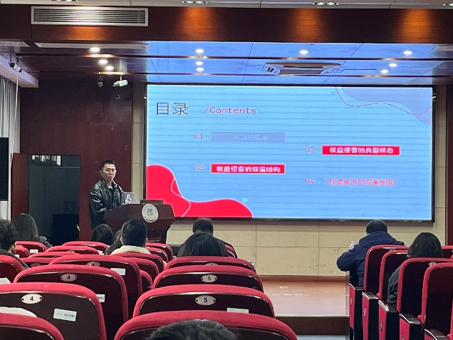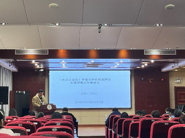 吴天昊同学报告的题目是《食品安全法中惩罚性赔偿制度实践困境及对策建议》,吴天昊同学以《食品安全法》中的惩罚性条款为切入口,通过对相关法律条文的解读、案例分析以及司法解释的梳理,提出完善惩罚性赔偿制度的建议,为食品安全法律体系的完善和消费者权益保护提供了参考。