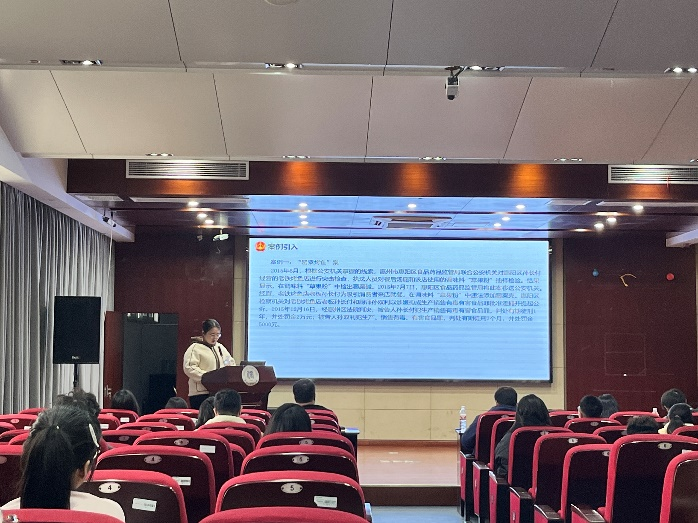 施文雯同学报告的题目是《食品安全的法律规制困境和出路研究》,施文雯同学发现一系列食品法治方面的问题,集中表现为监管体系上不完善、食品企业法律意识不足和消费者维权意识淡薄等,需要从企业自律、社会监督等各个方面,构建食品安全的社会共治格局,充分确保人民群众的食品安全。