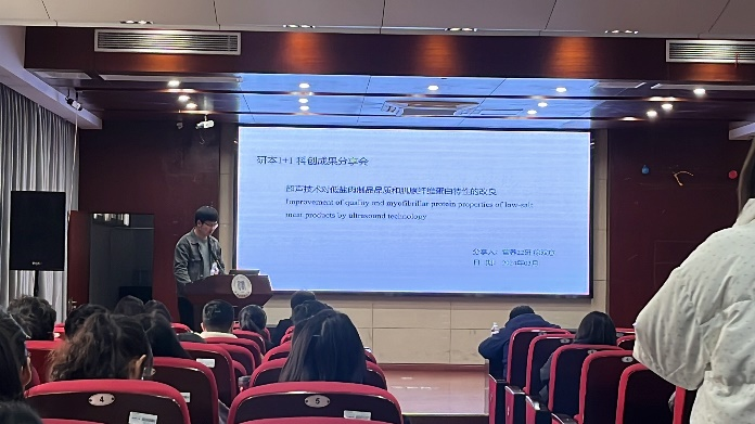 徐双意报告的题目是《超声技术对低盐肉制品品质和肌原纤维蛋白特性的改良》,徐双意同学认为超声波作为一种新兴、绿色、安全和可靠的非热加工技术,其深入分析了超声波被应用于降低肉制品钠盐含量的诸多优势。