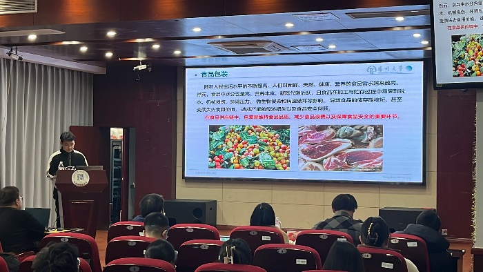 恽大为同学报告的题目是《花色苷在食品智能活性包装中的应用》,恽大为同学聚焦花色苷的pH响应变色功能可用于制作颜色指示剂智能包装膜这一特性,探究将天然色素花色苷用于智能和活性食品包装方案。