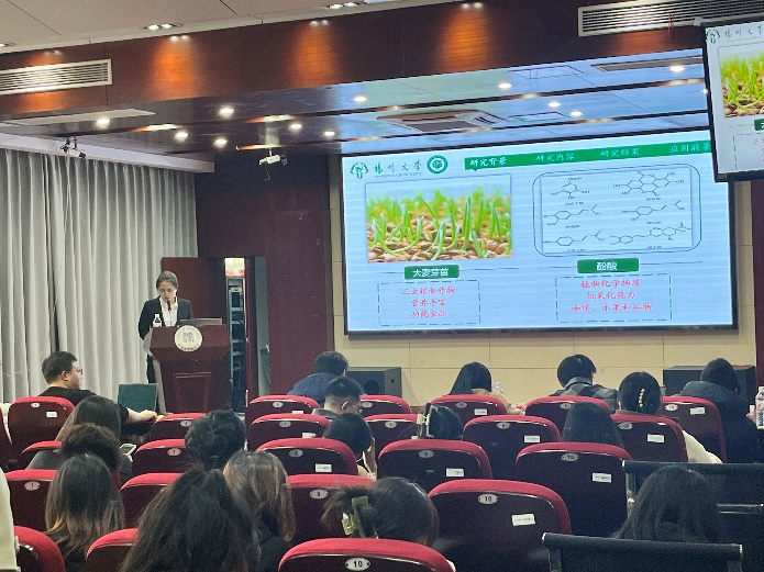 胡美霞同学报告的题目是《大麦芽苗中酚酸富集及其食品开发》,胡美霞同学利用水杨酸处理大麦芽苗,不仅激活了抗氧化系统,增强其抗氧化活性,而且增加酚酸生物合成途径中酶的活性和基因表达水平,促进了总酚酸的富集,该研究为以富集酚酸为原料的功能性食品提供了依据。