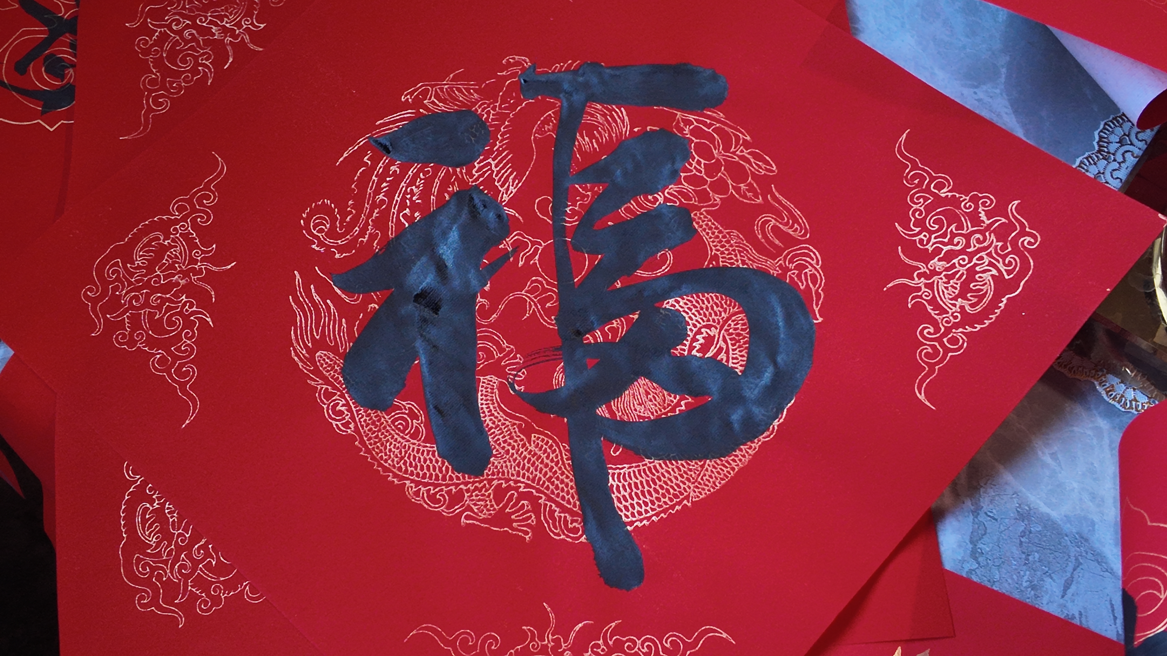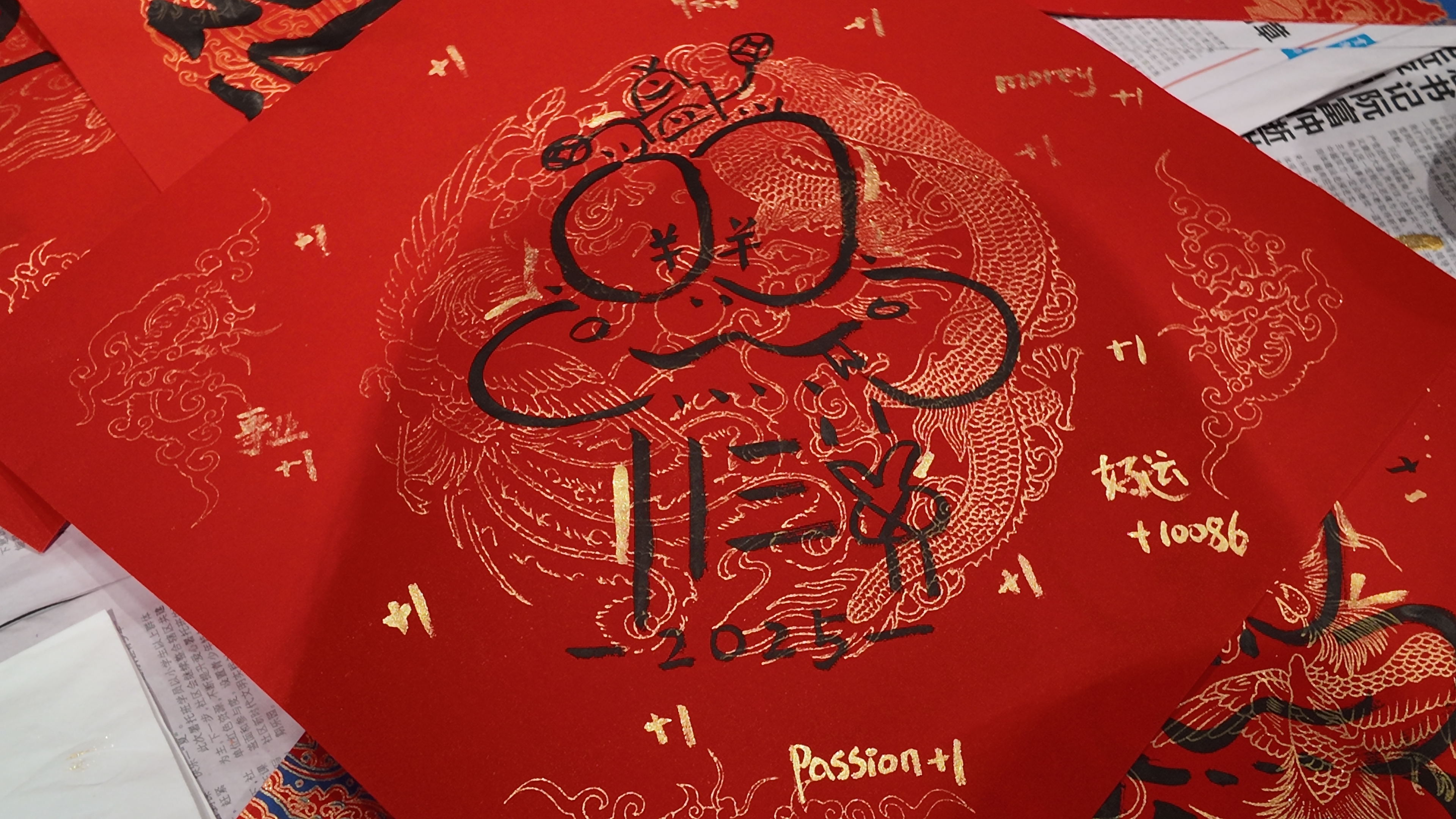 参加活动有来自不同课题组的博硕士研究生及部分导师。他们在现场红纸铺展,拿起毛笔,全神贯注地投入到对联和福字的创作中,顿时墨香弥漫。有的或独自沉思,斟酌字句;或相互交流,讨论笔法。不一会儿,一幅幅或苍劲有力或飘逸灵动的书法作品便呈现在眼前。既有传统的吉祥春联,也有别出心裁的创意福字,形态各异,饱含着对新年的美好期许。