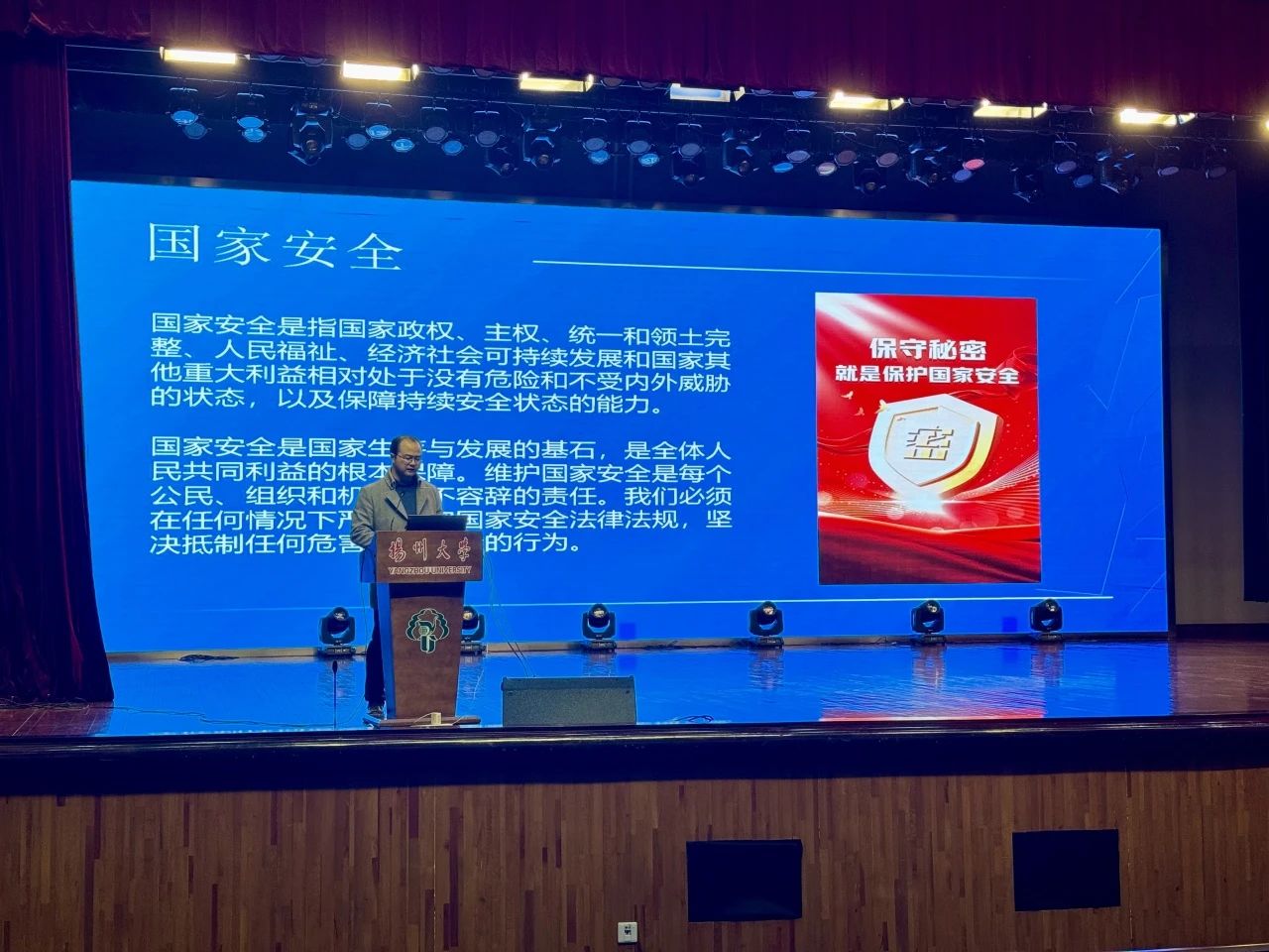 陈玉龙老师首先以“国家安全”为主题进行动员讲话。他强调了国家安全的重要性,指出“国家安全是全体人民共同利益的保障”,并详细解读《国家安全法》《反间谍法》等法律法规。通过“韩某某境外间谍罪”等真实案例,警示同学们需提高警惕,严防网络交友、兼职工作中的泄密风险,切勿传播敏感信息,坚决抵制危害国家安全的行为。