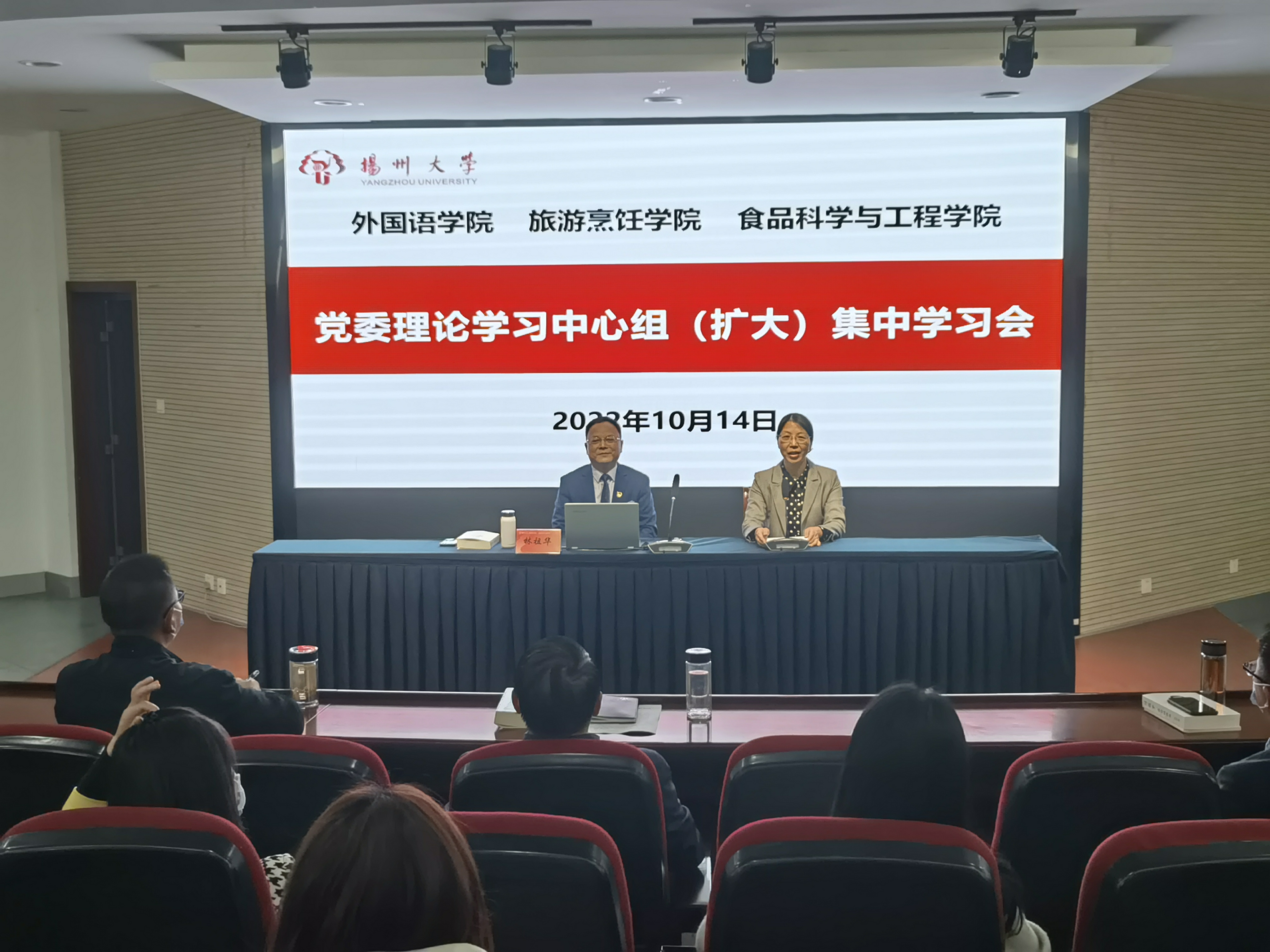 10月14日下午,食品科学与工程学院党委、旅游烹饪学院党委和外国语学院党委在笃行楼N302报告厅举行三院联合党委理论学习中心组(扩大)集体学习会,专题学习《习近平谈治国理政》第四卷。旅游烹饪学院党委书记解小青主持活动。