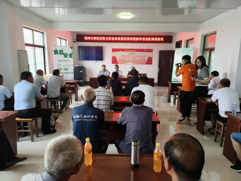 揭牌和共建协议签署仪式结束后,还举办了校地企三方座谈会。在座谈会上,学校、政府和企业代表三方畅所欲言,共谋发展。当天下午,学院“食”在有方师生科技助农服务团走访调研了江苏科伦多集团、江苏花果山食品有限公司等企业,校企双方就当前食品生产情况、产业升级、人才培养等展开深入交流并达成合作共识。在灌云县杨集镇三图村,“食”在有方师生科技助农服务团为当地村民举办了一场以食品安全为主题的涉农培训,并现场解答了村民们提出的各类问题,受到了当地村民的热烈欢迎。