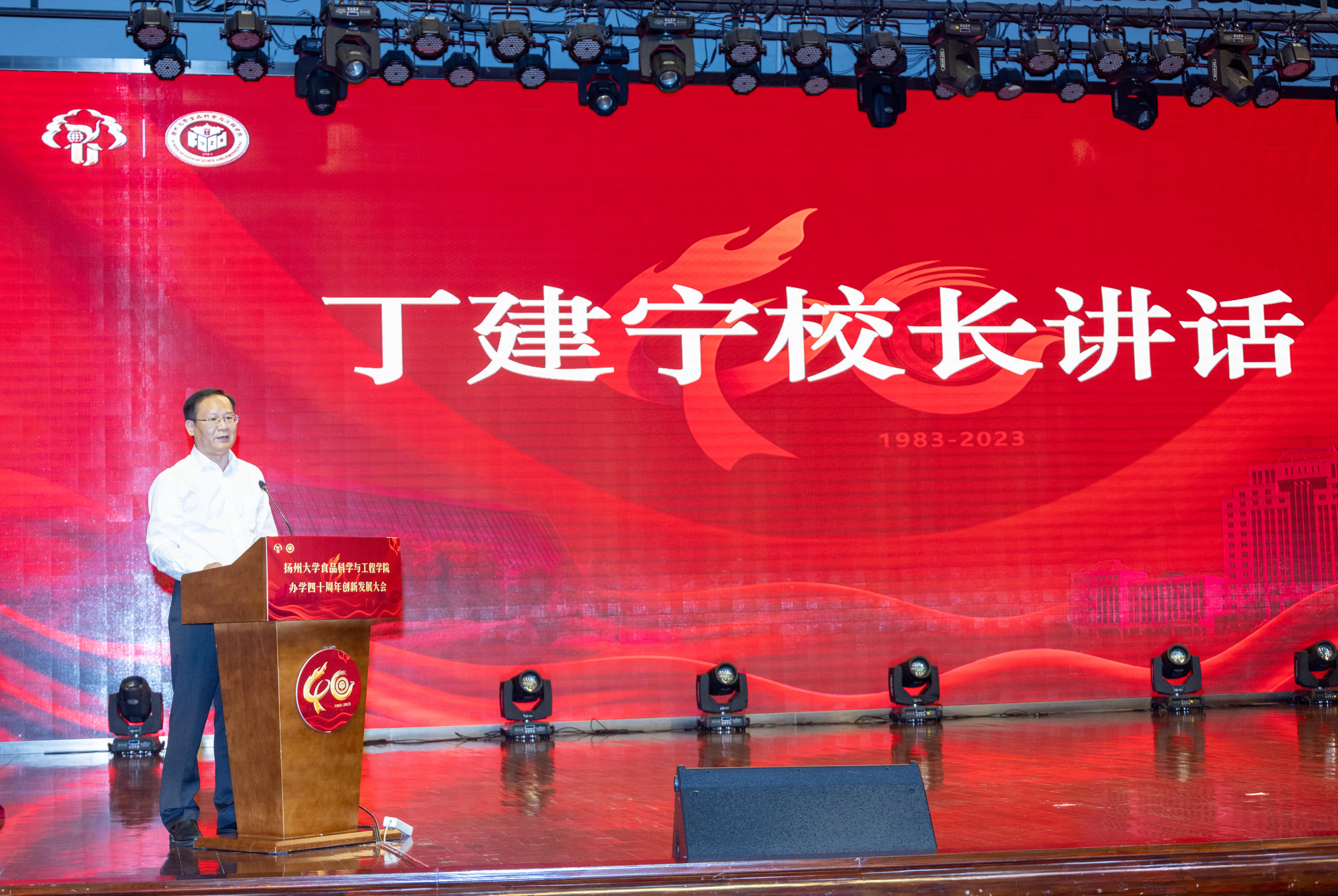 校长丁建宁在大会开幕式上发表讲话。他首先代表学校向食品学院办学四十周年表示祝贺,向食品学院广大校友致以亲切的问候,向一代代艰苦创业、辛勤耕耘的老领导、老教师表示崇高的敬意,向长期关心支持学校事业发展的各位嘉宾表示衷心的感谢!丁建宁指出,当前食品科学与工程学院正处于历史最好的发展时期,正蓄势待发迈向更加美好的未来,学校将一如既往地支持学院发展。丁建宁对食品学院今后的发展提出三点希望和要求:一是要坚守办学初心和使命,进一步凝聚高质量发展的不竭动力。以办学四十周年为新契机,立足国家需求和食品产业发展,紧扣学校高水平研究型大学建设目标和校第四次党代会、“十四五”规划确立的目标任务,发扬钉钉子精神,保持优良传统,聚焦中心工作,脚踏实地、行稳致远,再创一个新的发展黄金期。二是要聚焦内涵建设,进一步提升学科专业整体实力。面向食品学科发展前沿,依托综合性大学优势,进一步凝练学科发展方向,狠抓教学科研,找准发力点、定向突破,尽快在全国高校同类学院中进入前列。要建好建强一级学科博士学位授权点、国家级一流本科专业建设点等,高质量通过国家工程专业认证,深化人才培养体系改革,全面提升人才培养质量。三是要聚力经济社会发展,进一步推进产学研用深度融合。进一步面向经济社会发展需求,加快推进产教融合,推进科技创新,建强优势团队,着力培养适应现代农业和食品制造领域发展需求的具有大德、大智、大气和鲜明扬大烙印的一流人才,产生更多具有重要价值的创新成果,为食品行业产业的发展提供更多更优秀的人才和技术支撑。
