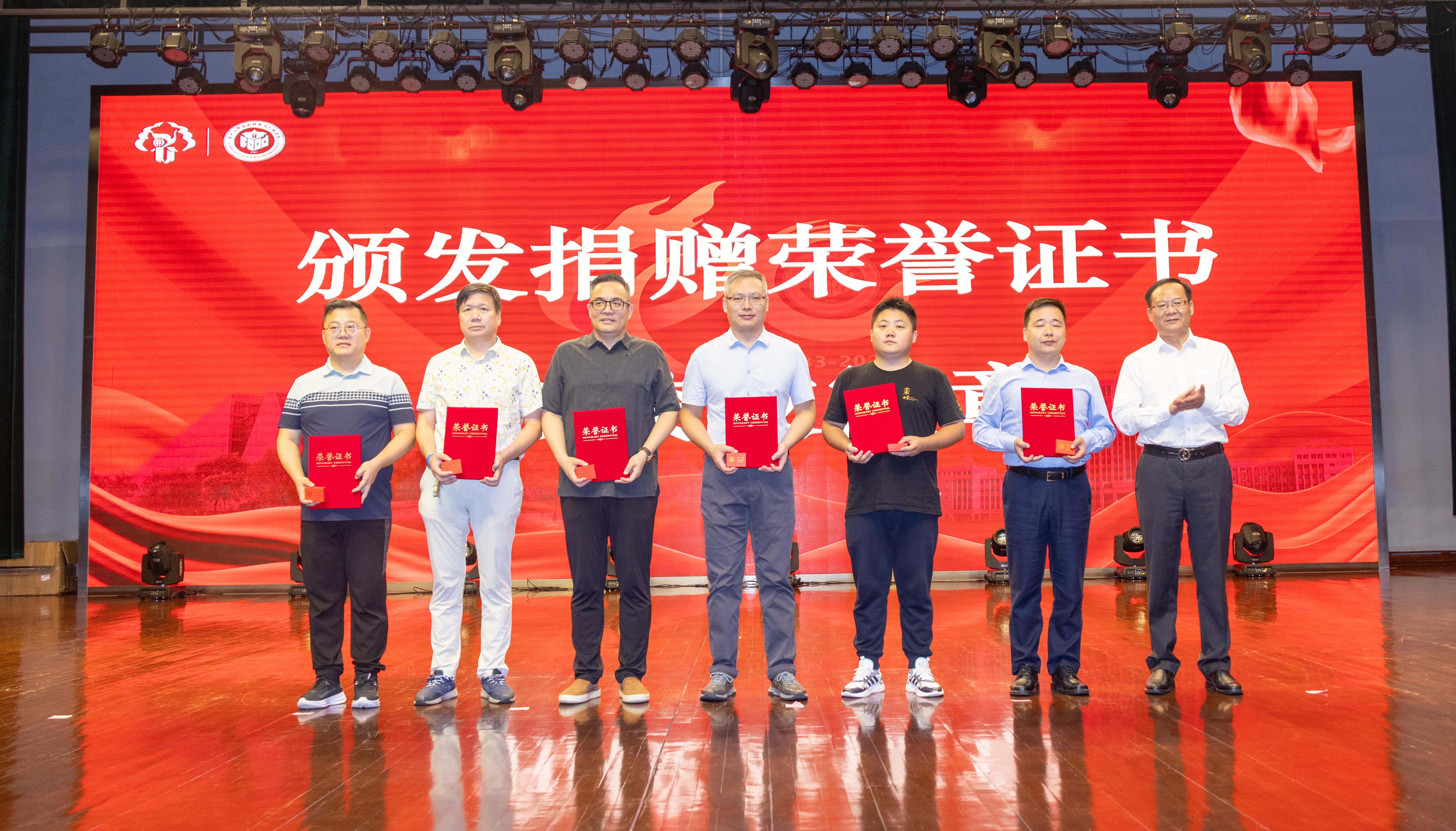 会上,丁建宁与校友、上海本优机械有限公司董事长胡金保共同为“校企学术交流中心”揭牌,并为胡金保、李正华、茅凯东、王小勇、单康、郭伟等六位校友代表颁发捐赠荣誉证书和校友徽章。