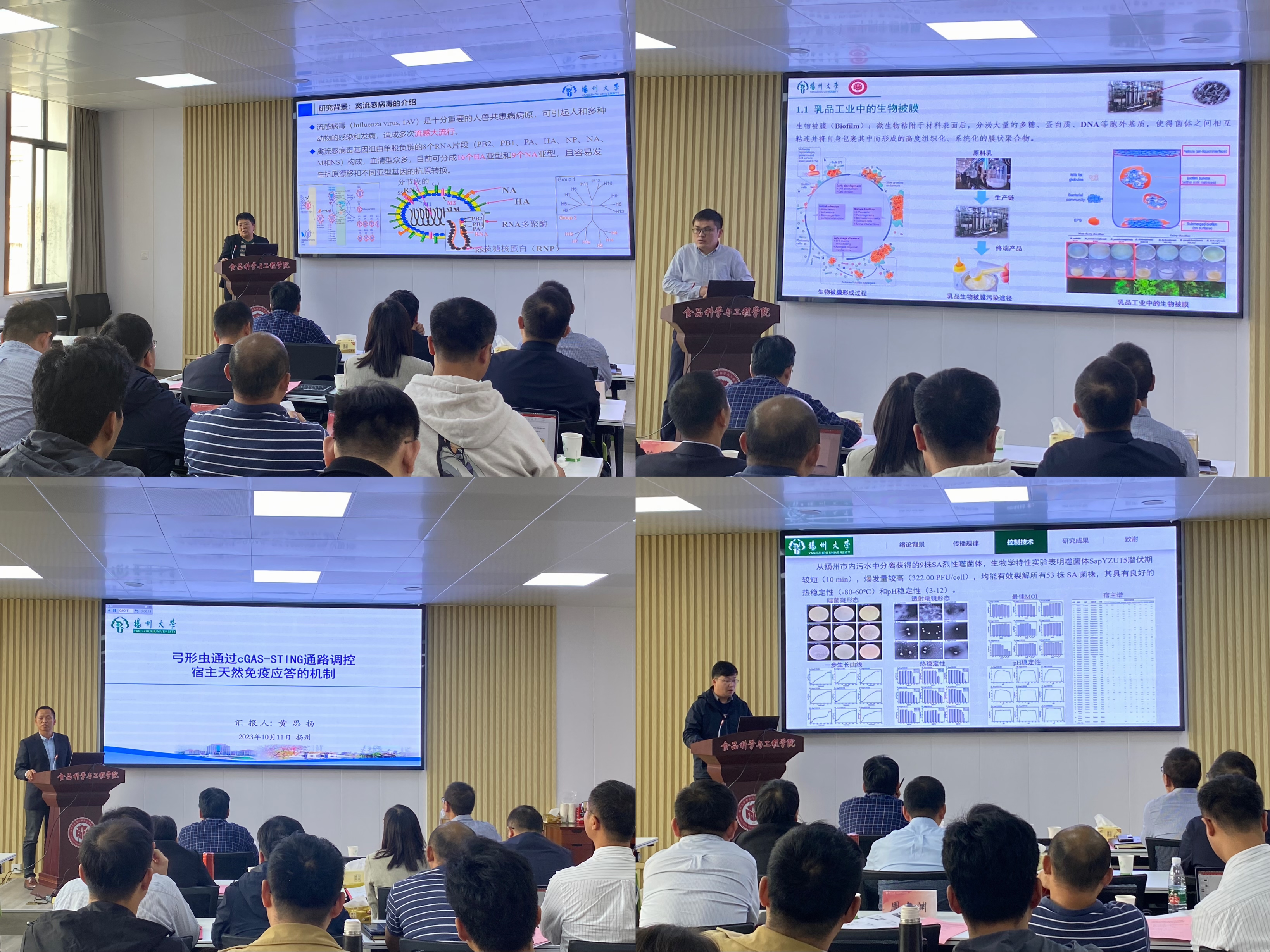 学校学科建设办公室副主任熊飞教授、兽医学院院长王志强教授、食品学院院长杨振泉教授,以及兽医、食品学院的相关教师、博士后和研究生共40余人参加此次论坛。来自两个学院的8位老师对各自在动物疫病防控、食品清洁生产与检验技术等方面的研究成果进行了汇报和交流,进一步挖掘共同攻关的交叉学科方向与问题,并为我校“一流学科”创建和标志性成果产出提供思路。