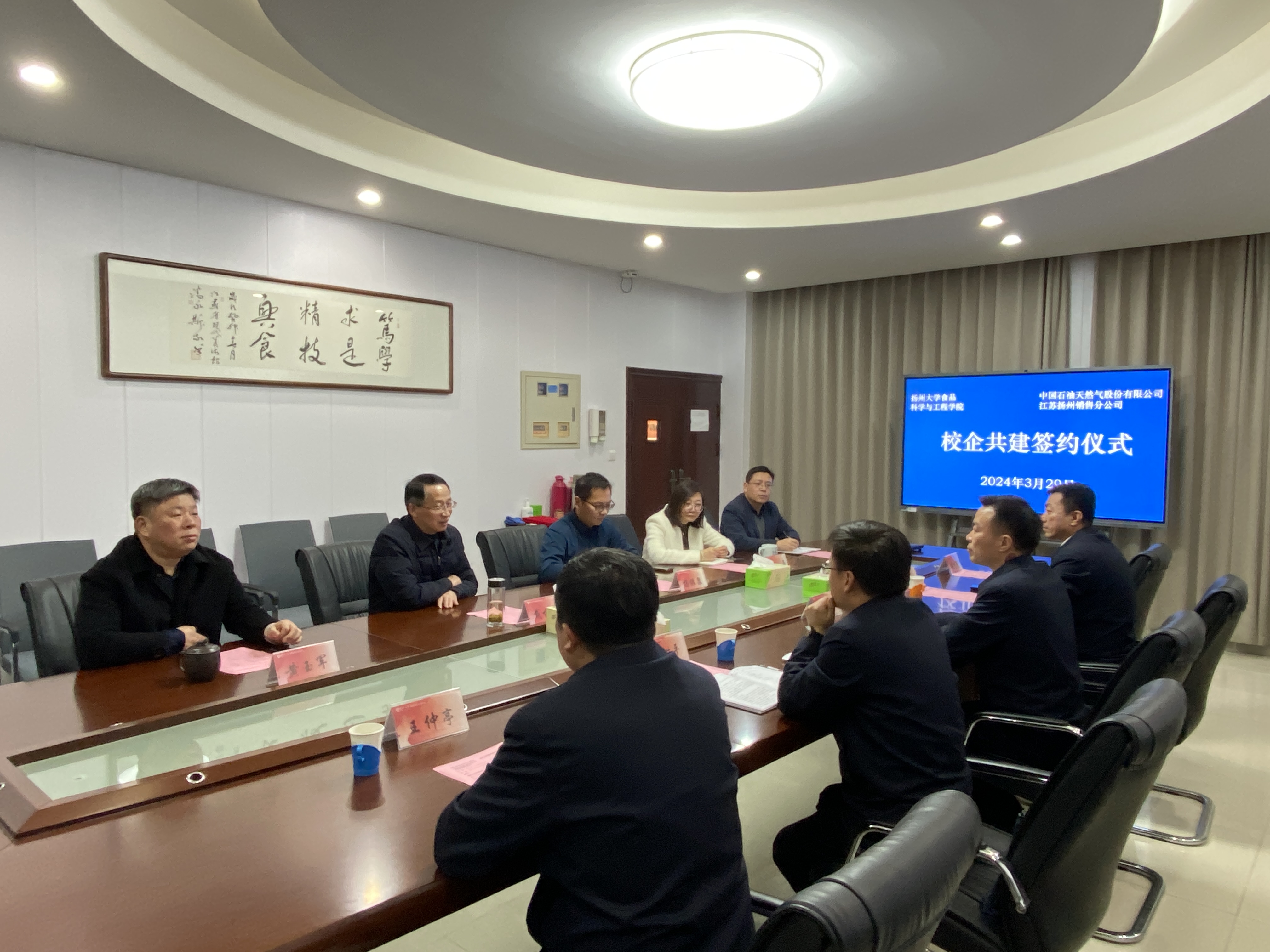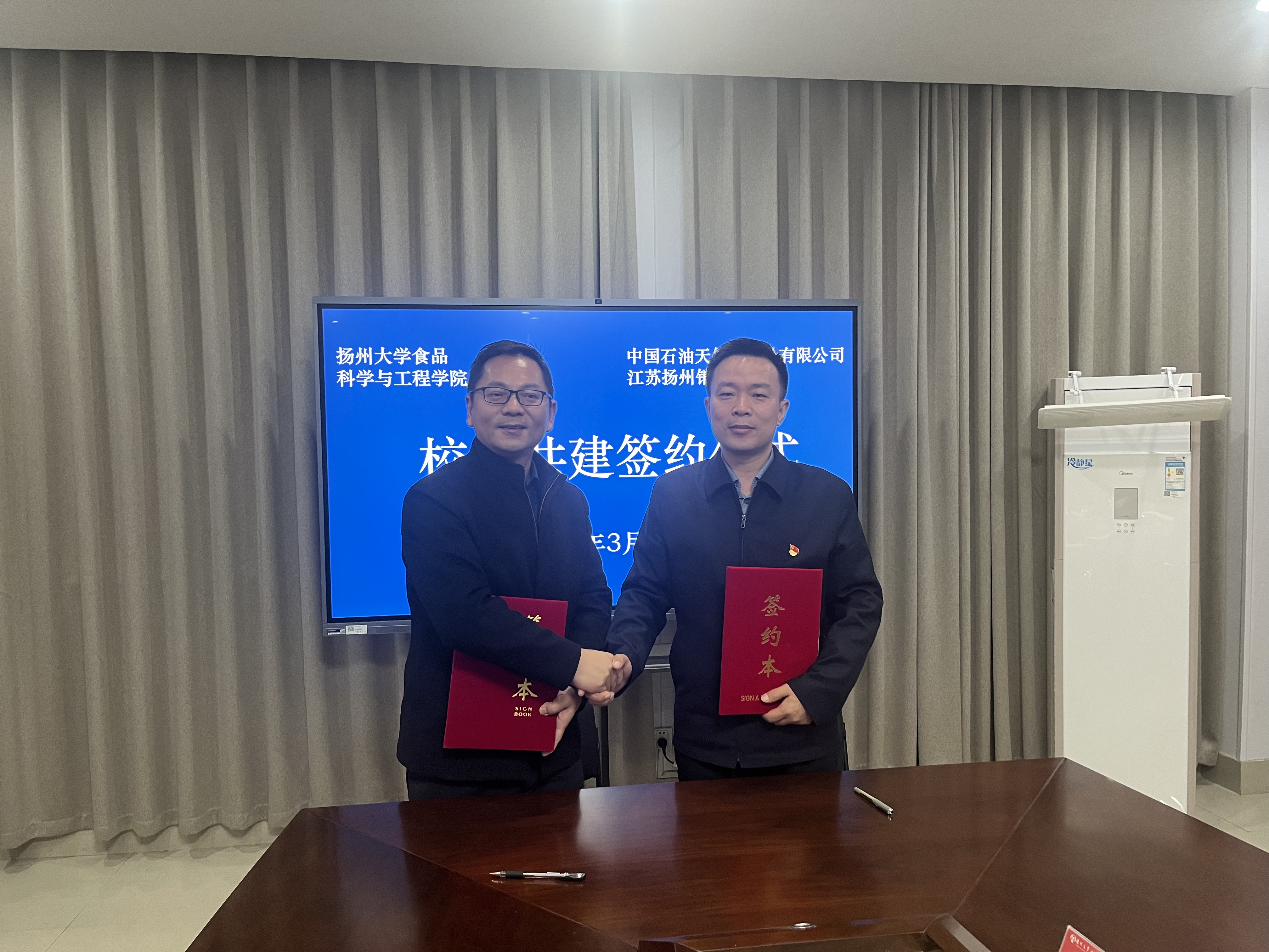 3月29日下午,扬州大学食品科学与工程学院与中石油江苏扬州销售分公司在扬子津校区举行了校企共建签约仪式。扬州大学食品科学与工程学院党委书记戴世勇,院长杨振泉,中石油江苏扬州销售分公司扬州分公司总经理、党委书记钱伟,党委常务副书记姜树平等出席签约仪式。