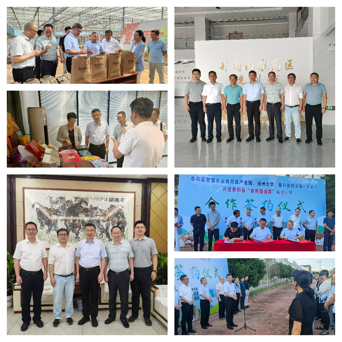 当天下午,刘巧泉一行还考察了泰和县螺溪镇藻苑村井冈山蜜柚基地和万亩稻虾共作(蓝龙虾养殖)基地、泰和县智慧农业食用菌产业园,并出席了泰和县“食用菌培育”科技小院合作签约仪式。杨振泉代表学院与泰和县泰嘉农业发展有限公司和泰和县螺溪镇人民政府共同签约,三方共建“食用菌培育”科技小院。