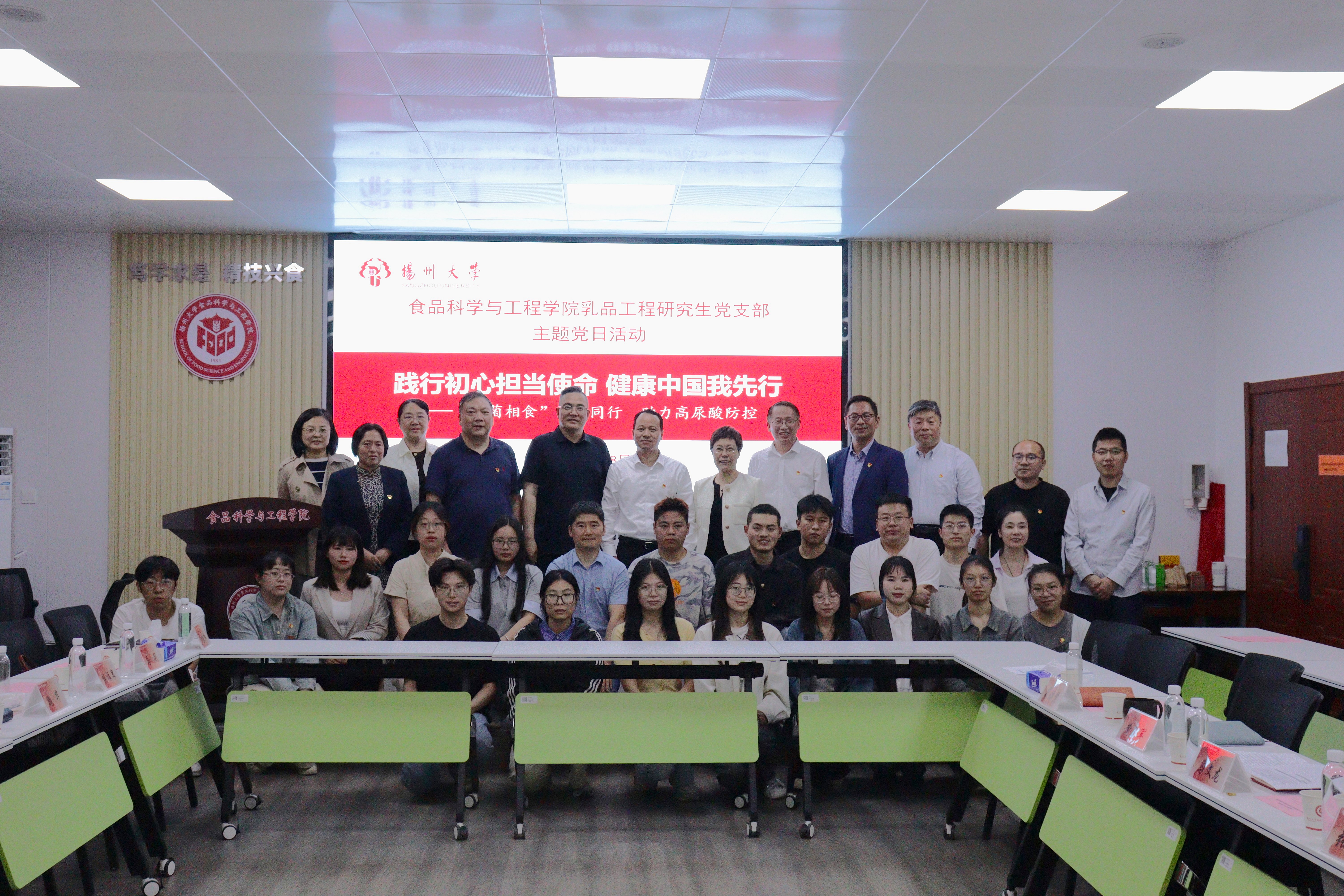 4月28日下午,我院乳品工程研究生党支部在笃行楼四楼本优报告厅举行以“践行初心担使命 健康中国我先行——‘与菌相食’医企同行 助力高尿酸防控”为主题的党日活动。校党委常委、副校长王承堂应邀参加活动并讲话,全国人大代表、苏北人民医院风湿免疫科主任魏华,苏北人民医院输血科科主任马莉、风湿免疫科副主任贾捷婷,校医院院长王晓红,校友、上海昊岳生物科技有限公司总经理茅凯东,院党委书记戴世勇、院长杨振泉、副院长黄玉军,江苏扬州现代乳业加工服务中心主任、“食品科学与工程”重点学科带头人顾瑞霞等参加活动。活动由乳品工程研究生党支部书记马文龙主持。