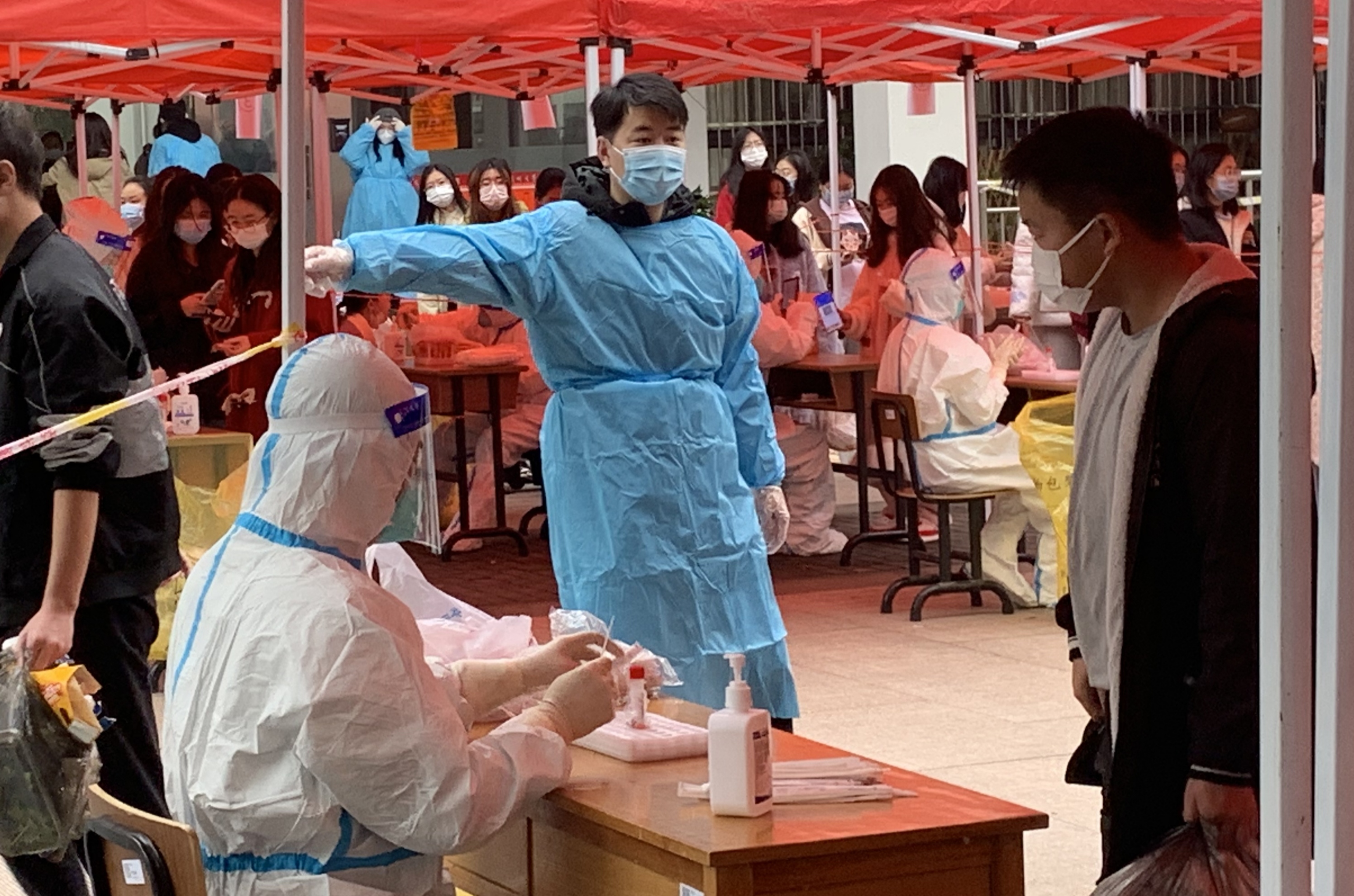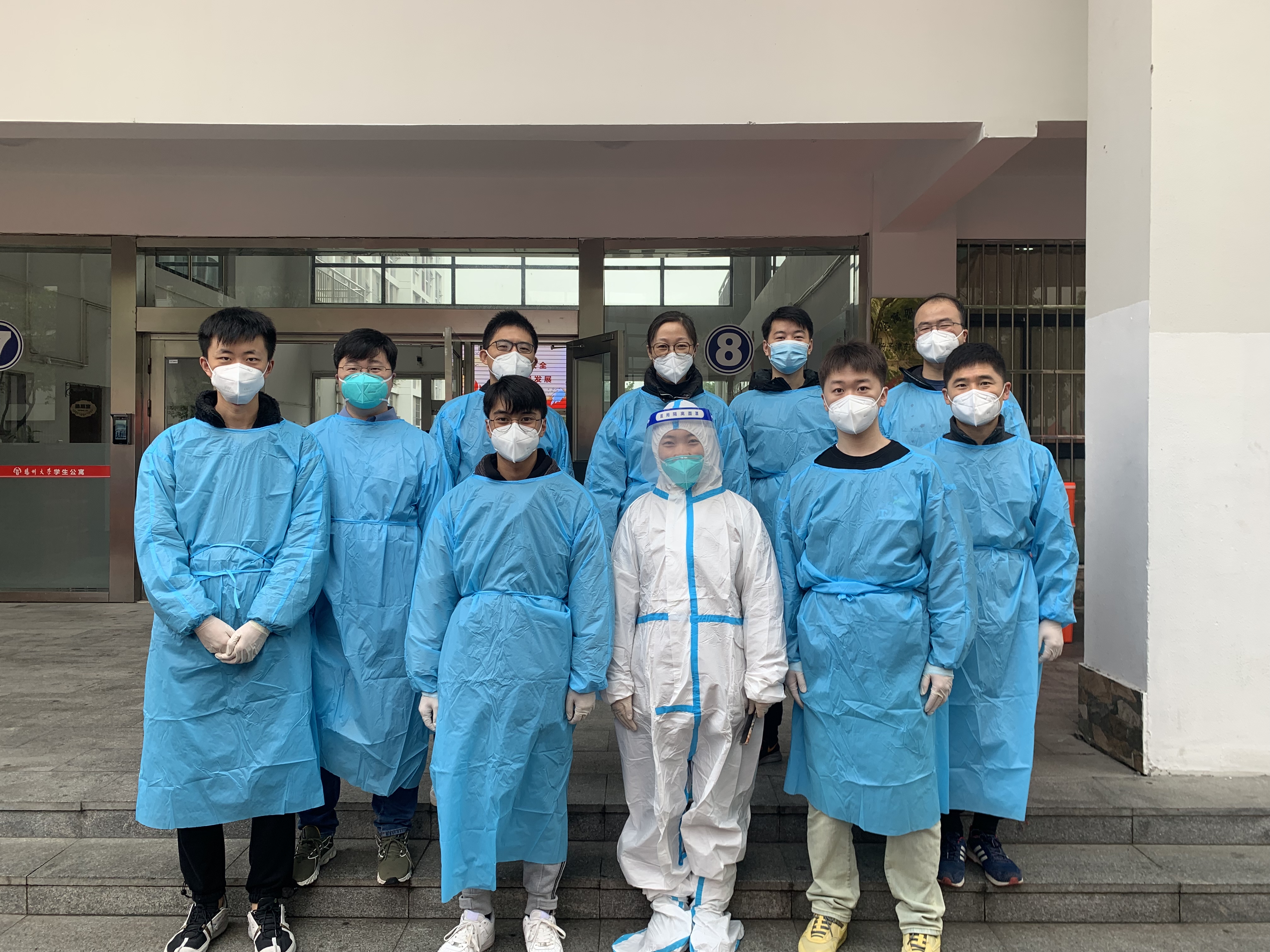 这只是扬州大学扬子津校区抗疫的一幕。从11月18日该校扬子津校区确认1例阳性感染者以来,根据疫情防控需要,扬子津校区暂时实行封控管理。因此,校区内的核酸检测、送餐配餐等工作量很大,人手严重不足。为此,扬大食品科学与工程学院迅速组建起一支青年博士教师志愿服务队。青年教师们在得知消息后纷纷主动请缨,要求加入志愿服务队。值得一提的是,该服务队的7名队员均为博士,平时他们奋战在教学科研一线,身穿白色“科研服”,现在又穿上了蓝色“志愿服”,奋战在抗疫一线。疫情期间,他们不仅按照教学计划完成线上授课任务,还根据学校的组织安排,有的组织核酸检测,有的在食堂配餐,有的在宿舍分餐……无论在哪个岗位上,他们都像在实验室做科研工作一样,干得特别认真仔细。