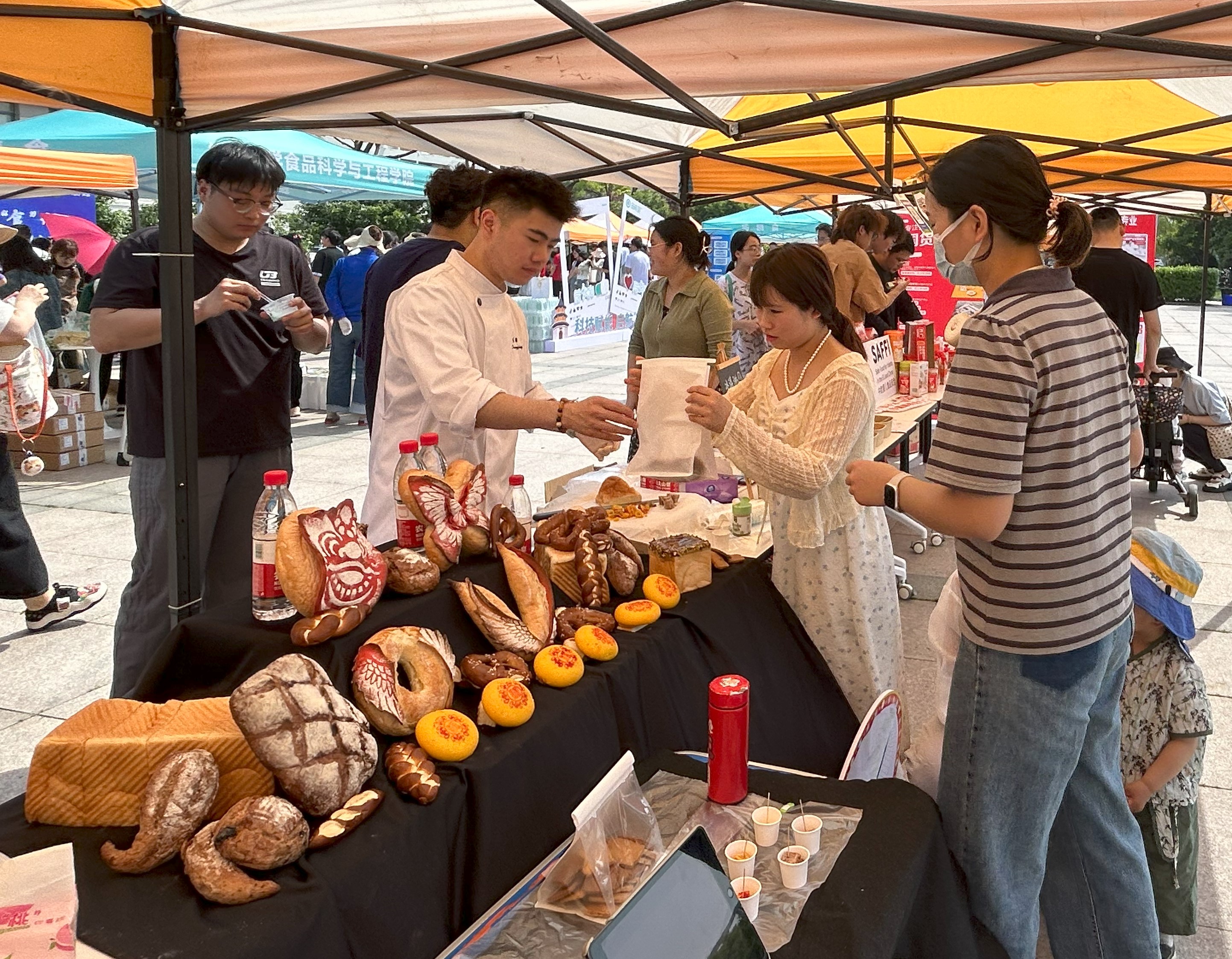 在食品学子兴趣小组产品展位区,学生制作了各类养生零食类、创新肉制品、创意冰淇淋类、以及烘培、饮品等科研团队研制的新产品,有益生菌和益生元的复合制剂合生元制成的冰激凌,还有本着药食同源理念的中草药桂花糕,更有经过酿造工艺后具备独特风味的黄油啤酒、百香果柠气泡水、祁红奶茶、冰晶粽、奶豆腐……各类美食让人垂涎欲滴,不少同学和老师纷纷驻足品尝,活动氛围热烈非凡。