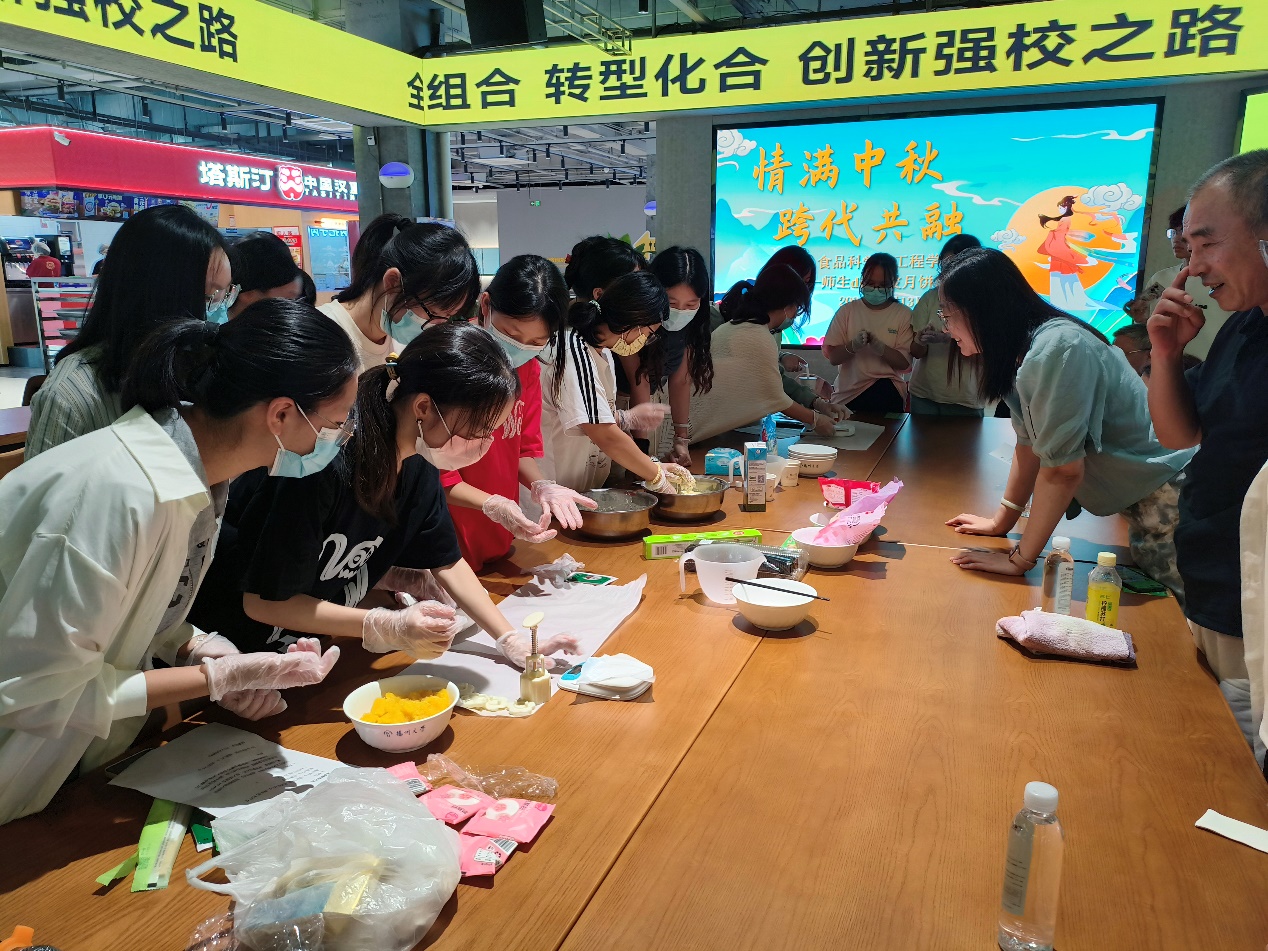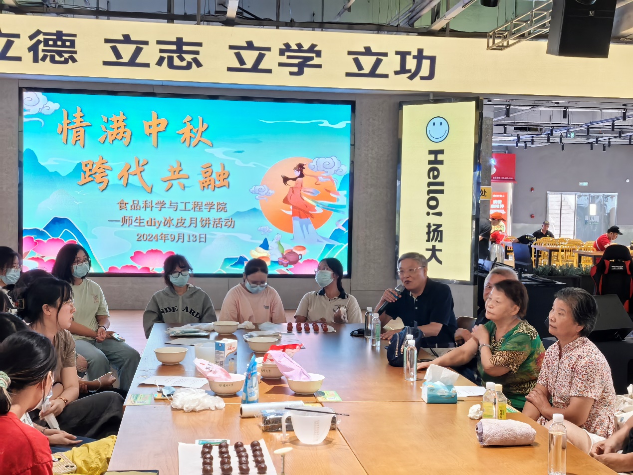 秋风送爽,丹桂飘香,中秋佳节即将如期而至。9月13日下午,食品科学与工程学院在东区食堂二楼举办迎中秋活动——师生DIY冰皮月饼。本次活动邀请院关工委常务副主任张素华,盐阜路离退休党总支第二党支部书记蒋建刚,支部委员、离退办主任史生龙,以及居留贯、施爱武等老同志,同时还有院关工委执行秘书陈斌、食安2101班学生及班主任张琛、食工2401班学生及班主任张慢。活动由院党委副书记杨晶主持。