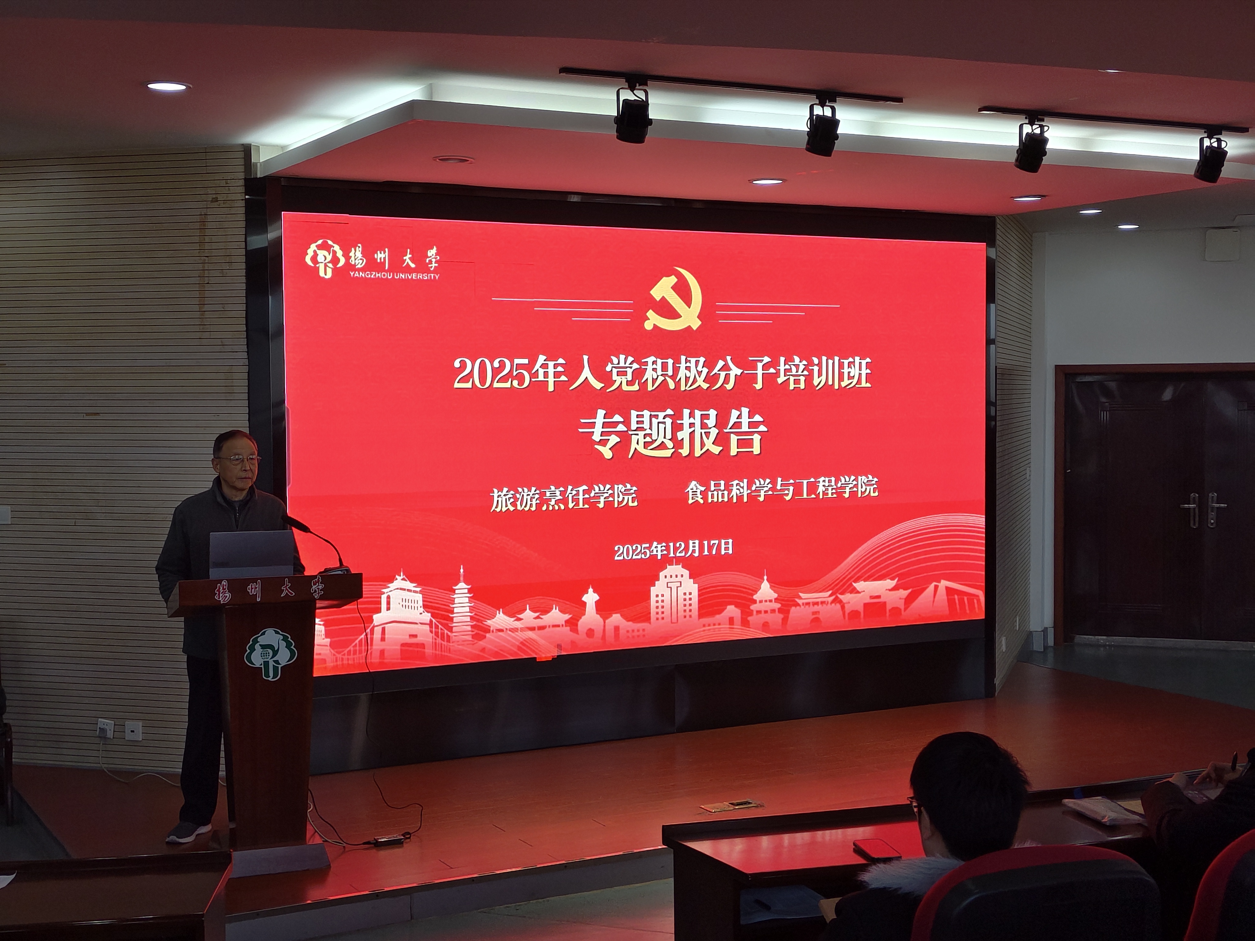 为引导入党积极分子铭记革命历史、传承伟大抗战精神,12月17日,我院联合旅游烹饪学院共同举办学院分党校2025年入党积极分子培训班,邀请校关工委理论宣传组讲师团成员费迅老师主讲,以“江淮永志民族魂——扬州人民抗战史事述要”为主题,带领全体学员重温烽火岁月中的扬州抗战记忆。