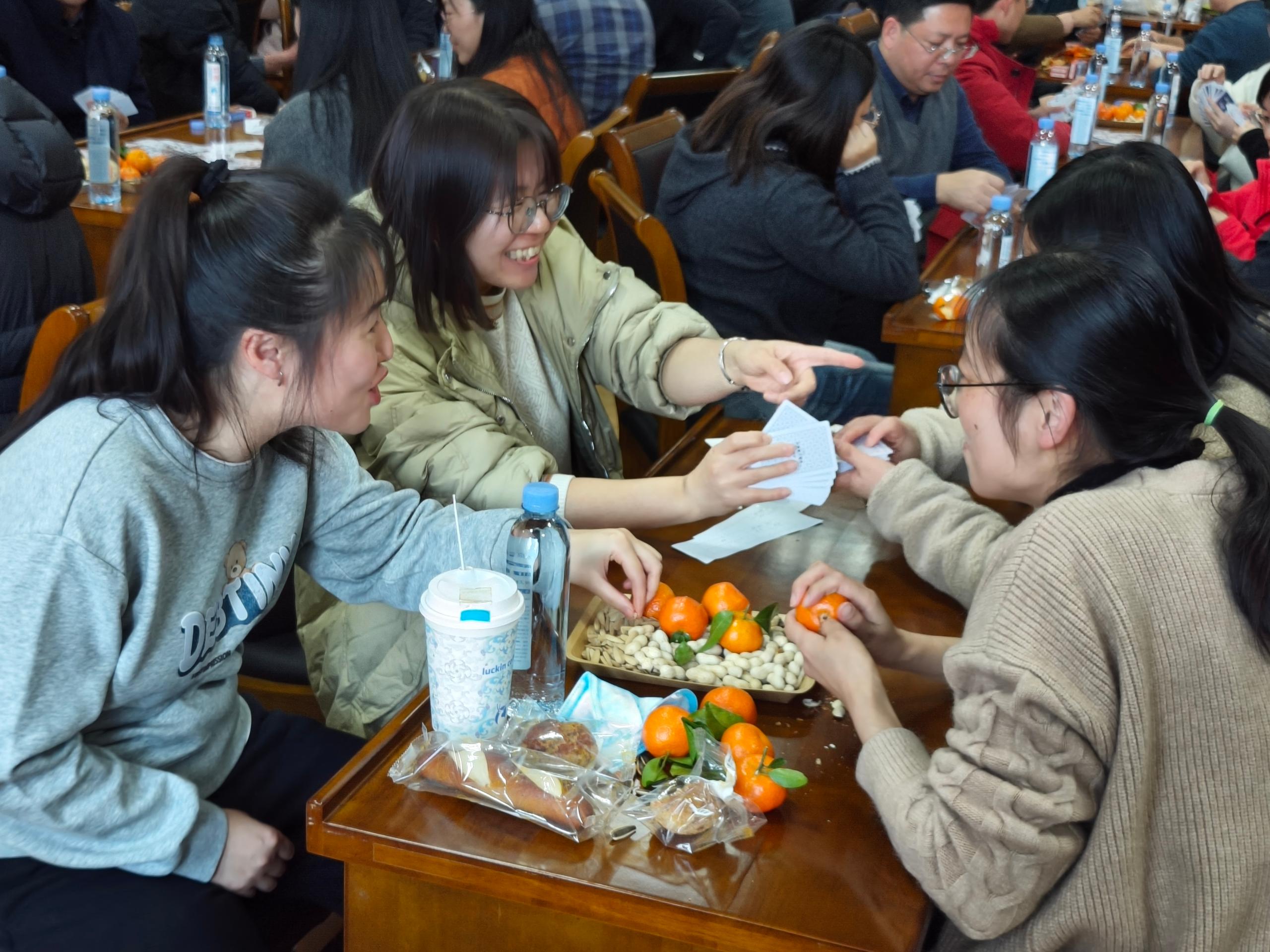 牌聚智慧,乐满食院。1月15日下午两点,食品科学与工程学院在文体馆西馆WN302报告厅举办新年掼蛋友谊赛。本次活动以牌会友、以赛促谊,吸引了全院众多教职工掼蛋爱好者参与。