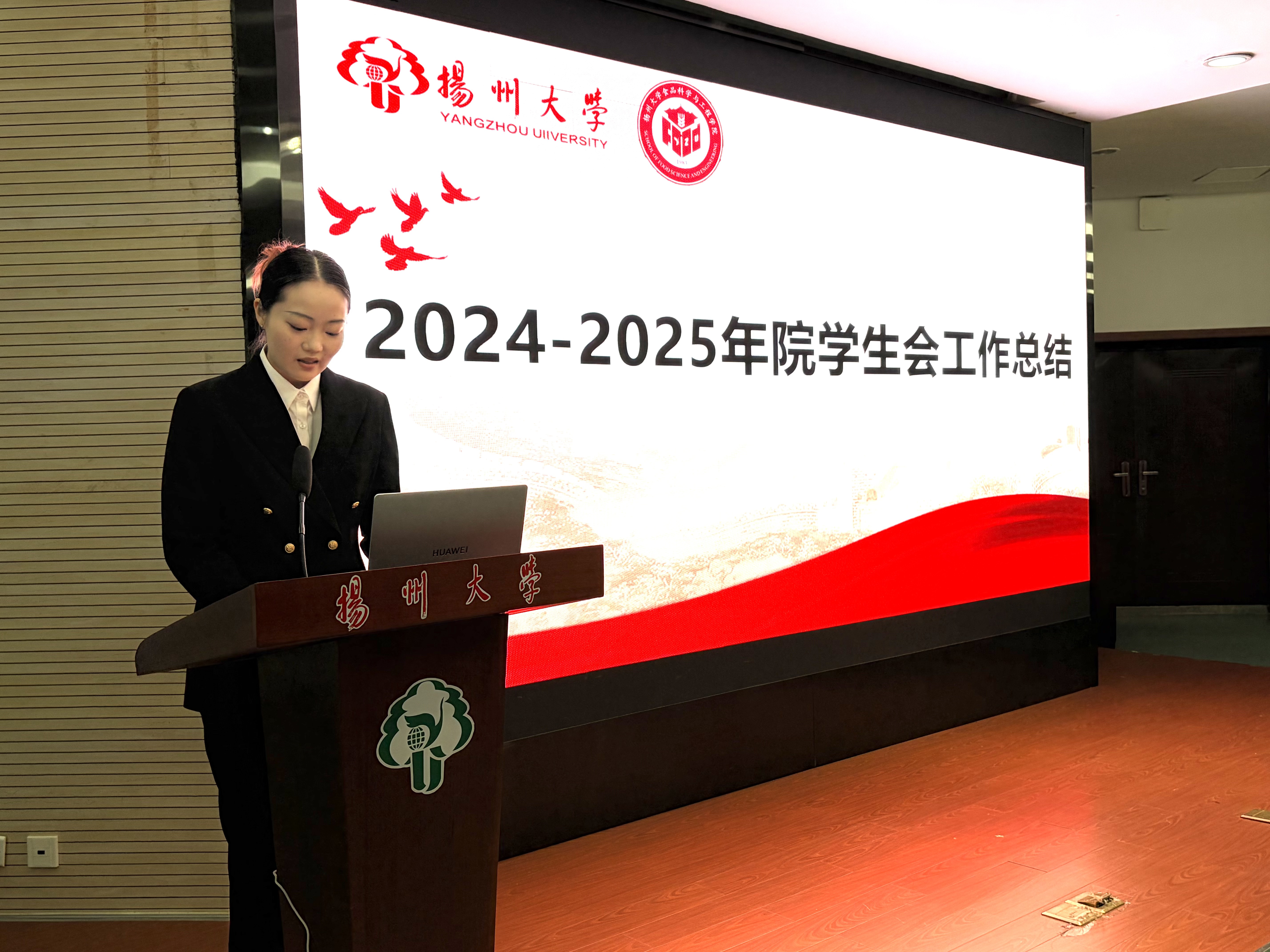 在杨玥老师的讲话之后,2024-2025届执行主席曹钰杰同学代表院学生会作了年度工作总结。她回顾,过去一年,院学生会积极搭建多元学习平台,定期组织法课堂视训学习会,强化自身建设,并开展各类活动,以丰富多样的形式帮助同学们理解生涯规划系列招聘会、宣讲会、考研系列活动,促进学生成长。