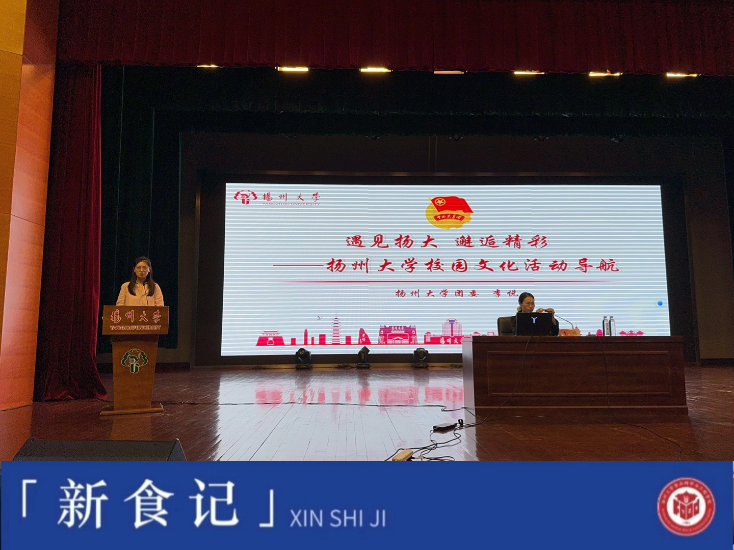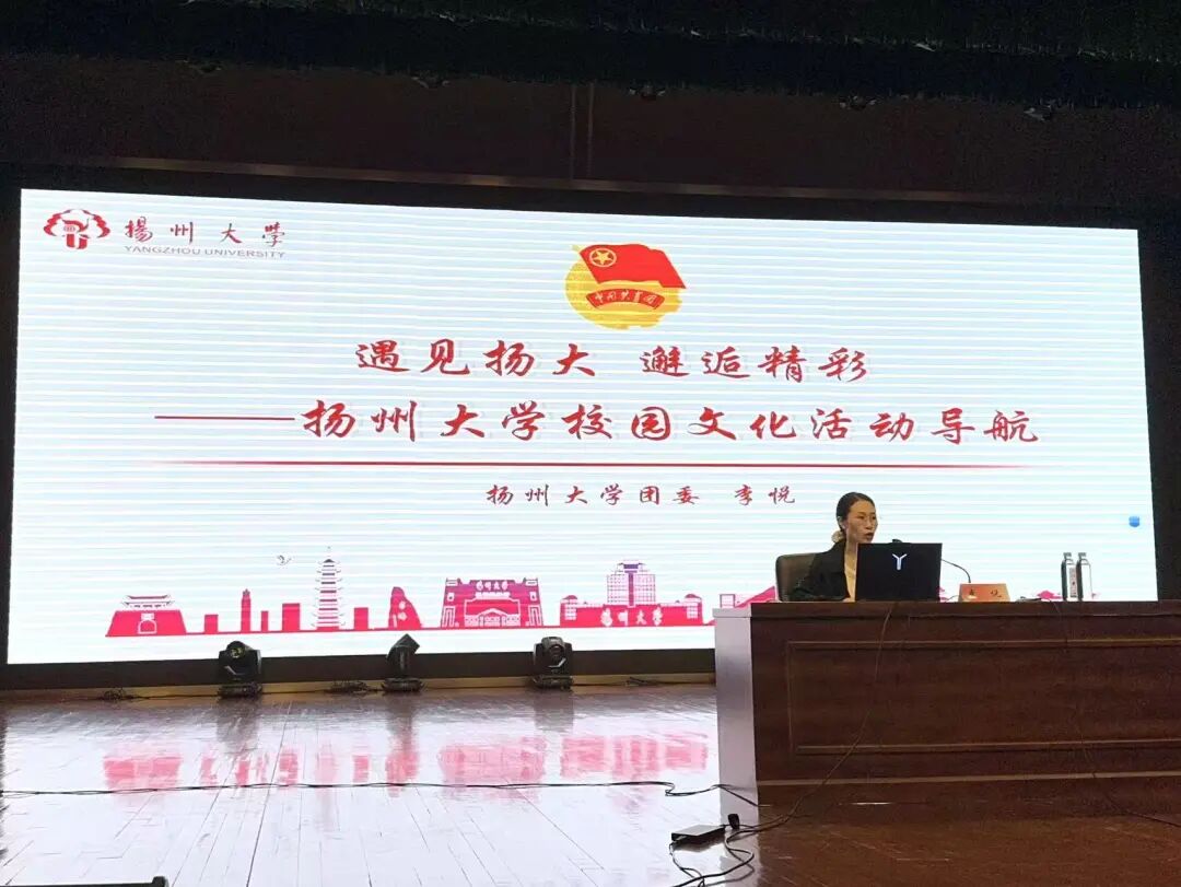 李悦老师以《青春向“扬”,逐梦迎“新”》宣传片引入,从“百年风韵——文脉传承与精神底蕴”出发,简要介绍了我校六个校区在“坚苦自立”校训引领下的文化底色。接着,她重点阐释了扬州大学“金字塔”型校园文化活动体系,该体系分为三个层面:“高端引领”包括科技文化艺术节、“菁扬系列”等大型活动;“百花齐放”涵盖各学院品牌活动、社团文化节和各类竞赛;“活力源泉”则聚焦班级、宿舍等人人可参与的文化活动。李悦老师还展示了我校各类重大活动和名人讲座,以及学术创新、文艺展示、体育竞技等多元平台,并特别介绍了我校“春之声”“秋之韵”等社团文化盛典。