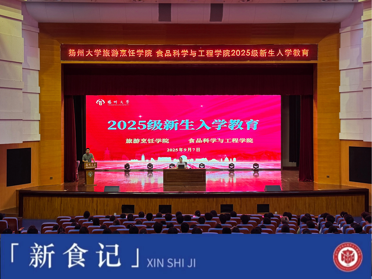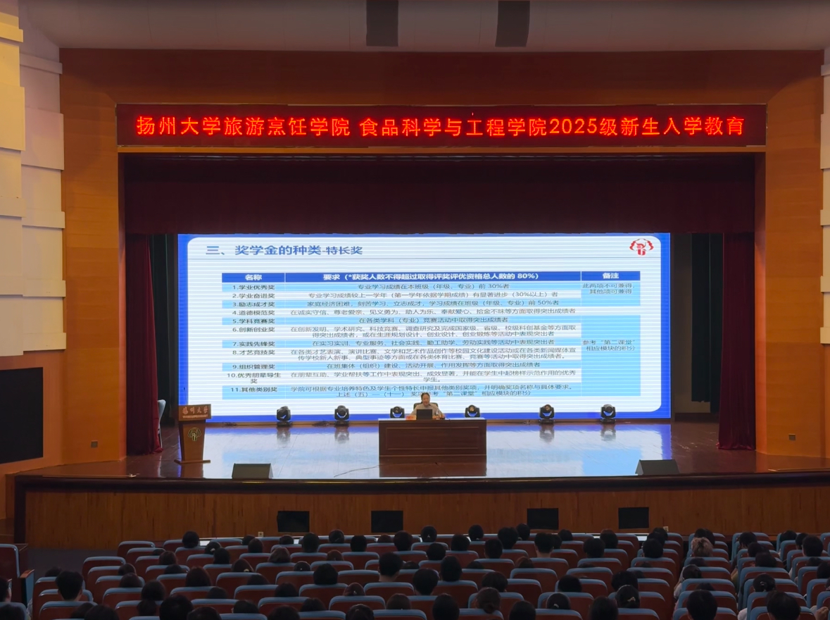 2025年9月7日下午14:45,食品科学与工程学院和旅游烹饪学院合办的2025级新生入学教育系列讲座在文体馆三楼小剧场成功开展。本次讲座围绕“学生资助”“奖学金评定”与“学生安全管理”三大主题展开,为新生带来全面细致的大学适应指南。讲座由校党委学生工作部(学生工作处)副部长(副处长)、学生资助中心主任杨方老师主讲,旅游烹饪学院团委书记(学工办主任)徐华林老师主持。