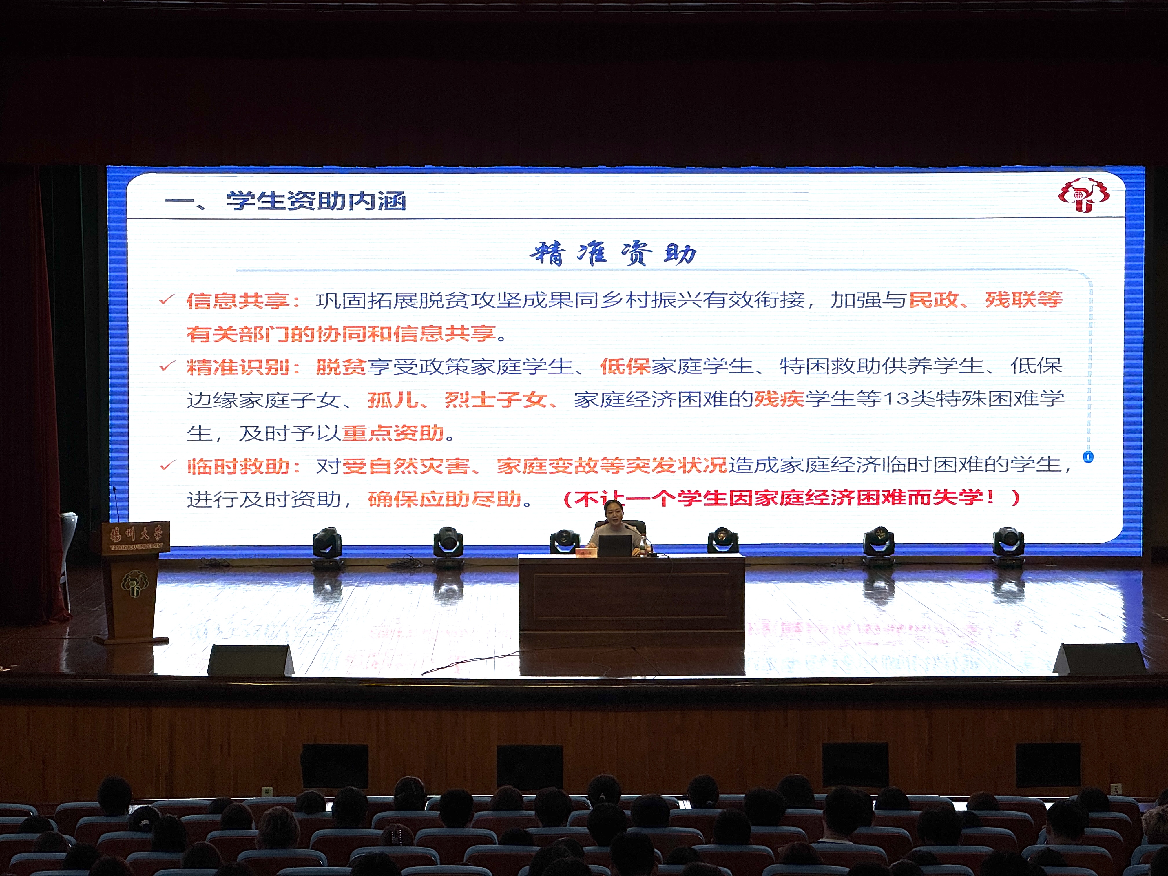 在第一篇章“学生资助”中,杨方老师系统介绍了学生资助工作的内涵与体系,详细讲解了家庭经济困难学生的精准认定机制、临时救助政策与勤工助学途径,并展示了学校“线上+线下”多元协同的宣传与服务方式。同时,学校着力推动“资助”与“育人”深度融合,依托朋辈教育、素质拓展和志愿服务三大平台,助力学生全面成长。