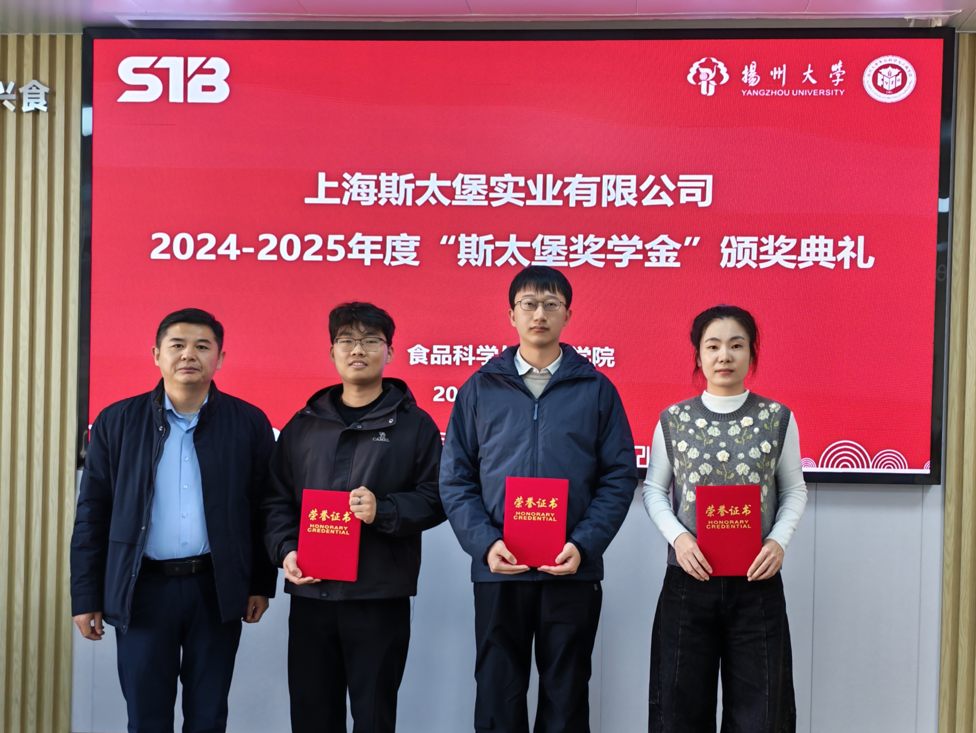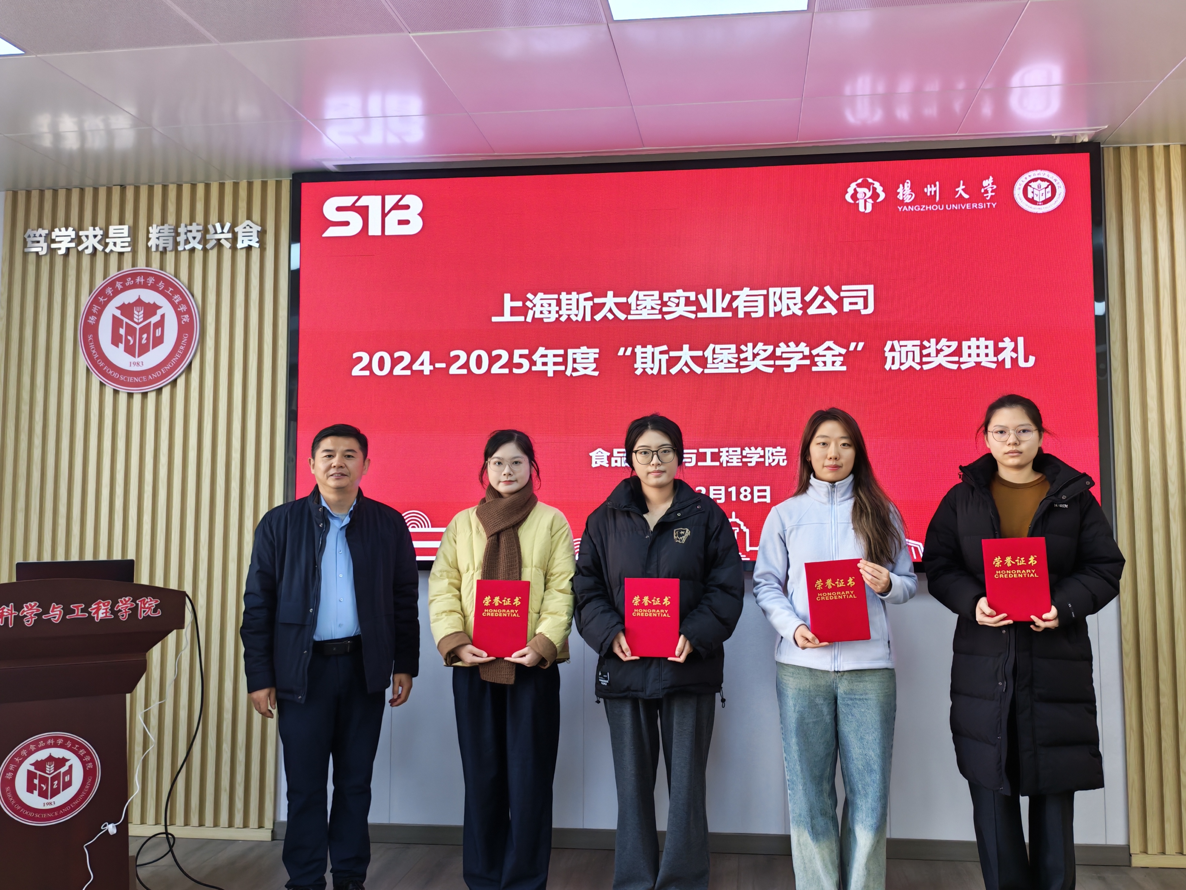 2025年12月18日上午,扬州大学食品科学与工程学院在笃行楼S426隆重举办了2024-2025年度斯太堡奖学金颁奖典礼。上海斯太堡实业有限公司副总经理史国清、院党委书记戴世勇、院党委副书记杨晶、辅导员陈斌出席本次活动,此次活动由院党委副书记杨晶主持。