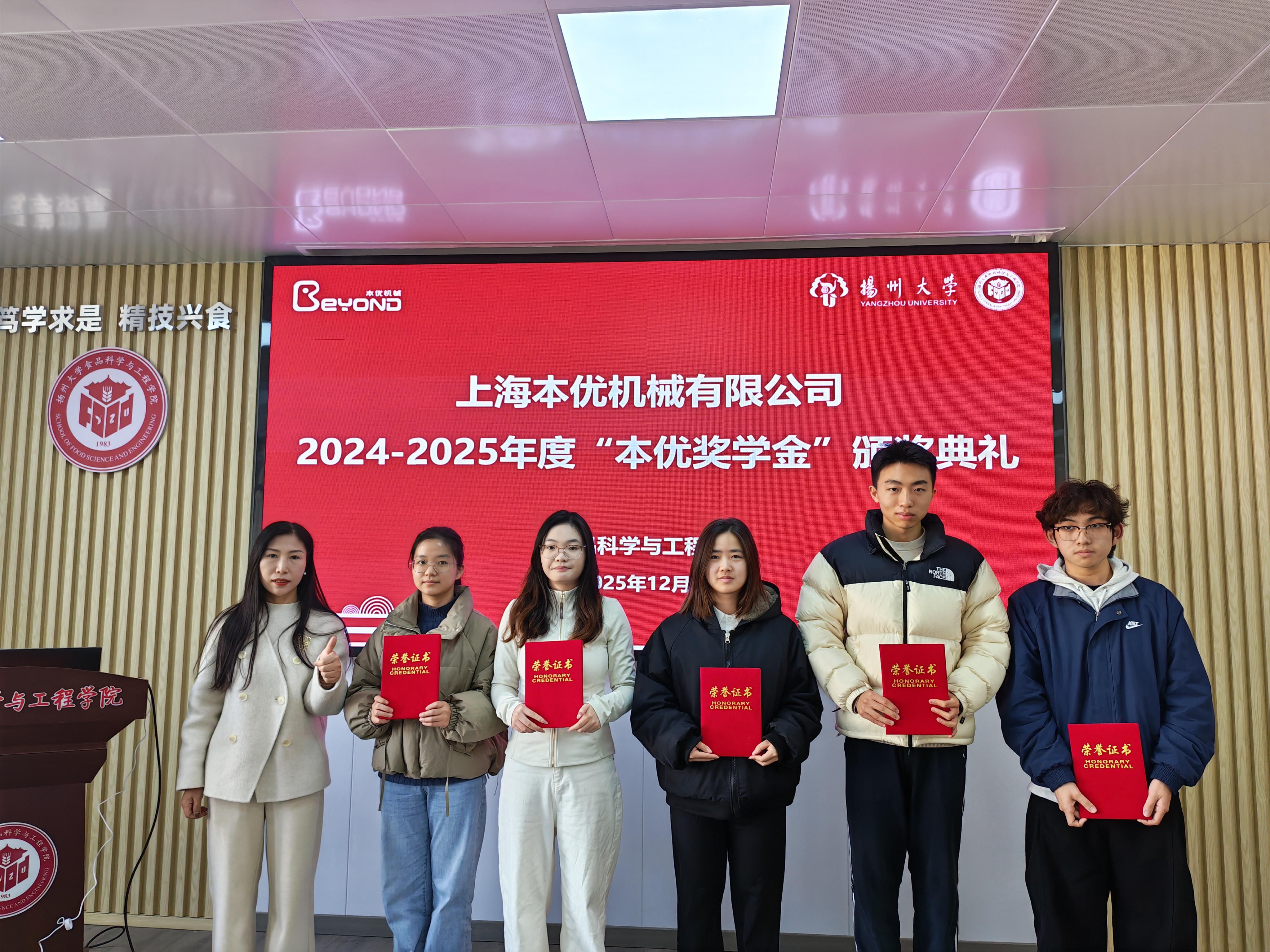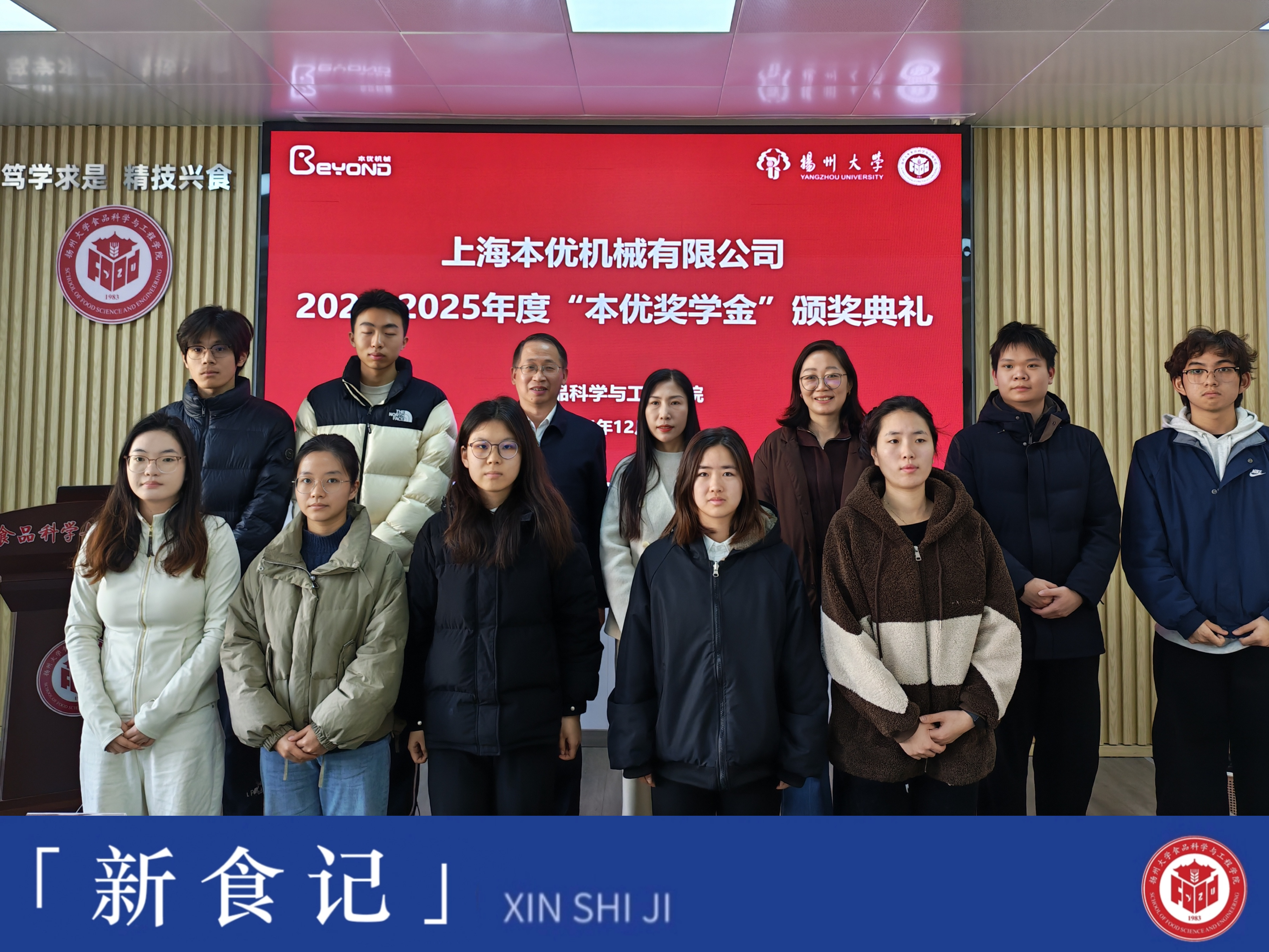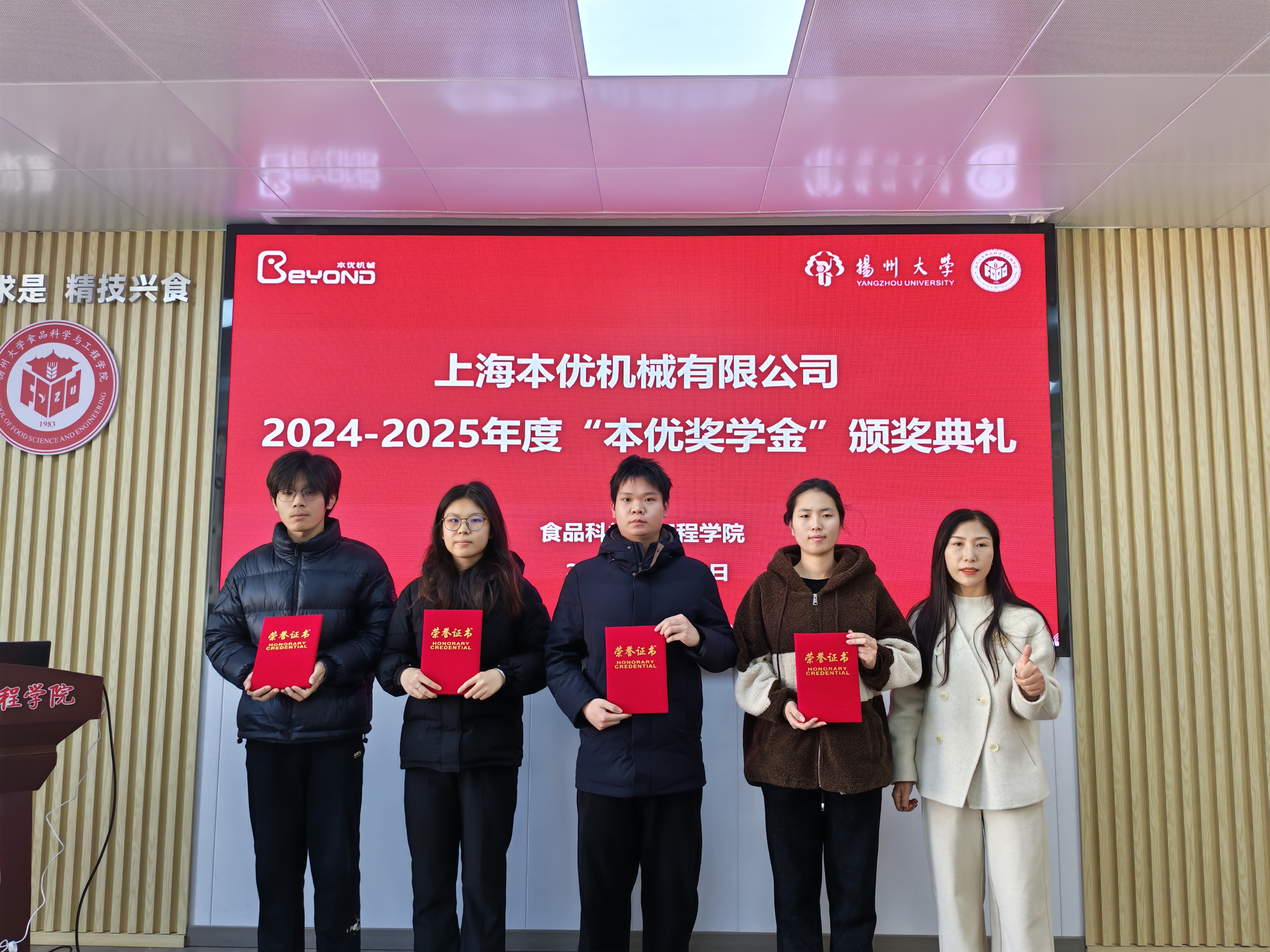 2025年12月18日上午,扬州大学食品科学与工程学院在笃行楼S426隆重举办了2024-2025年度“本优”奖助学金颁奖典礼。上海本优机械有限公司销售中心执行总监马坤茹、院党委书记戴世勇、院党委副书记杨晶和辅导员陈斌出席活动,此次活动由院党委副书记杨晶主持。