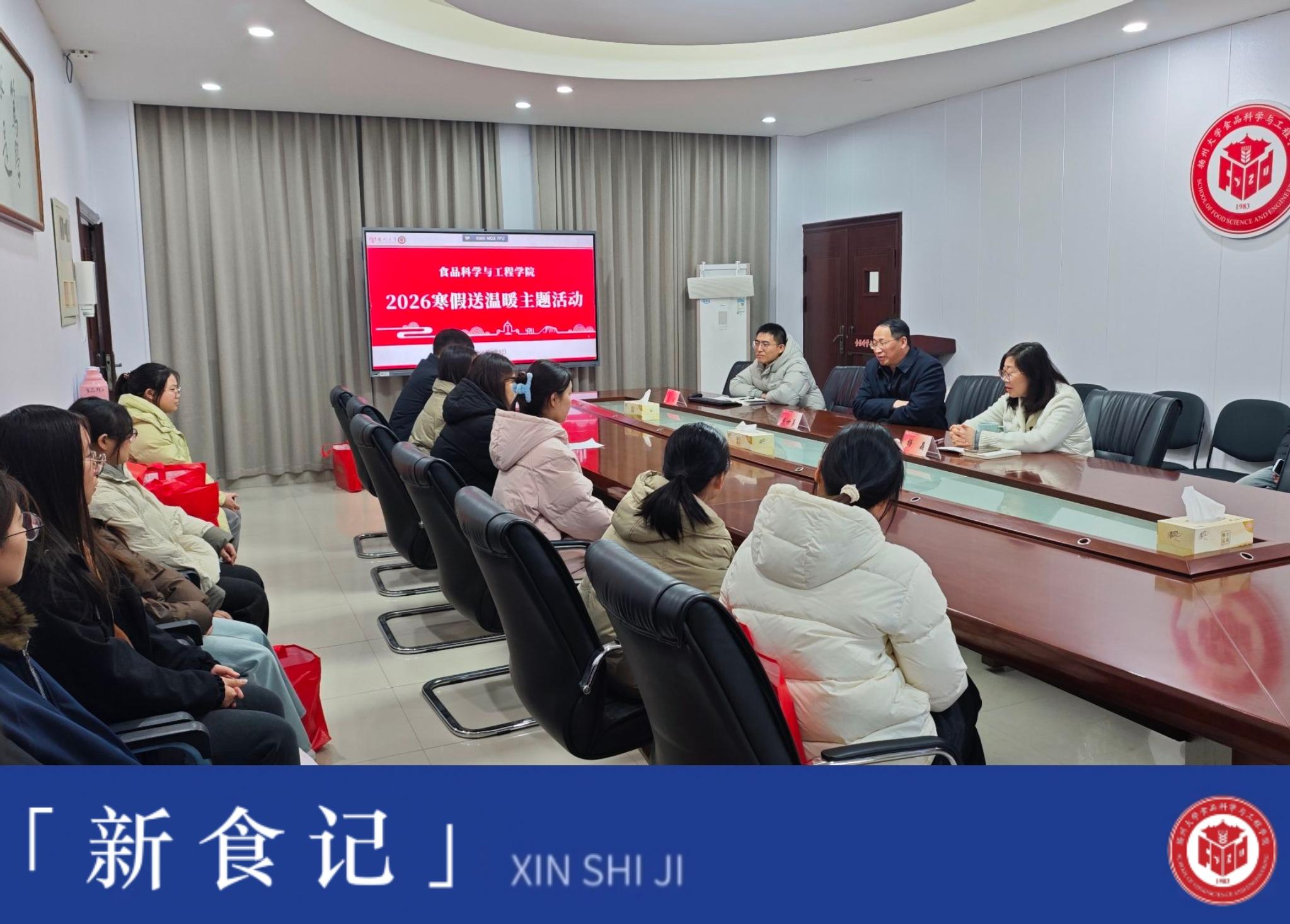 2026年1月9日下午三点,食品科学与工程学院在笃行楼SM401举办了一场温馨的寒假送温暖活动。院党委书记戴世勇、院党委副书记杨晶、辅导员陈斌与同学们齐聚一堂,在寒冷的冬日里传递学校的深切关怀与温暖祝福。