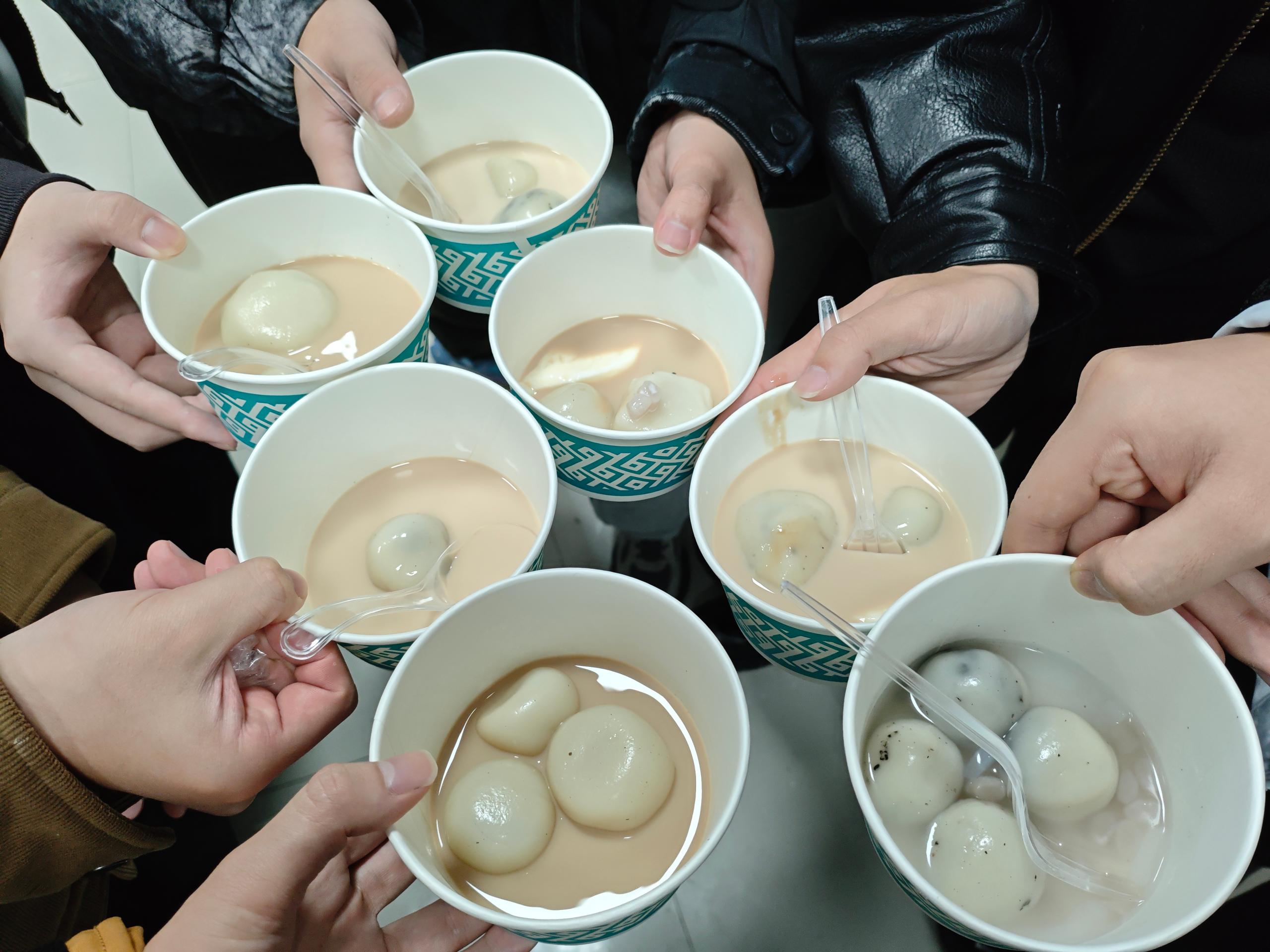 当一碗碗热气腾腾、香甜软糯的汤圆出锅后,同学们便围在一起创作汤底,在盛有汤圆的碗中加入芋圆、椰果等小料和各类茶汤。大家一起品尝亲手制作的汤圆,甜在嘴里,暖在心底,在劳动中收获成就感,在分享中感受节日温情。