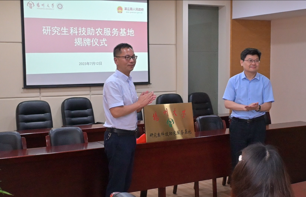 随后,杨振泉教授与陈新洪副县长共同为研究生科技助农服务基地举行了揭牌仪式。这标志着食品科学与工程学院与灌云县政府在科技助农领域的合作取得了重大突破。