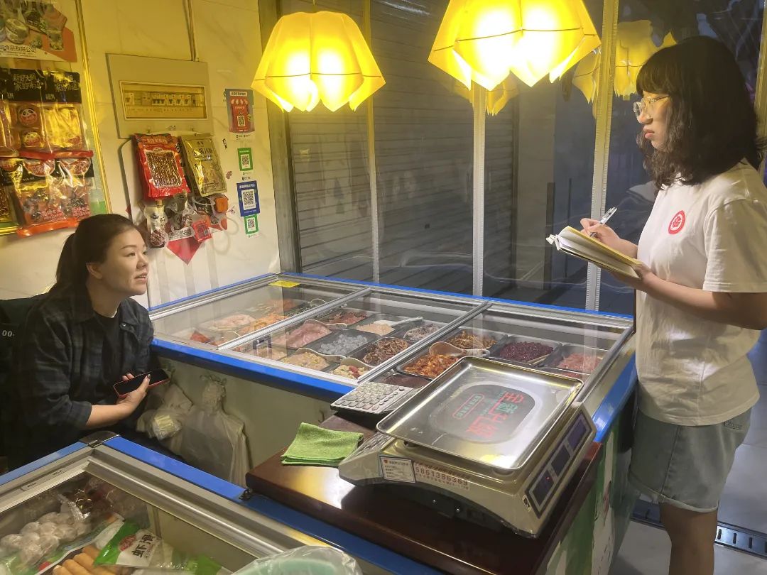 (7月14日,团队成员潘婧雯正在询问店主预制菜的销售情况。潘婧雯供图。)