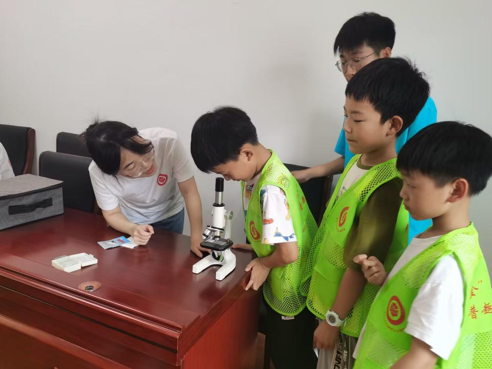 (7月8日, 团队成员梁霞指导小朋友使用显微镜。朱芷馨供图)